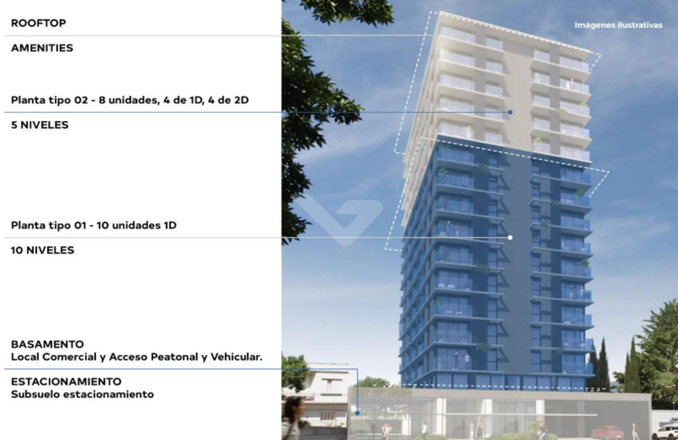Además, contará en el piso 16 con un rooftop con terraza panorámica perimetral y un salón de usos múltiples con cocina, baño y parrillero. Gimnasio, sala de juegos y dos parrilleros exteriores pergolados.