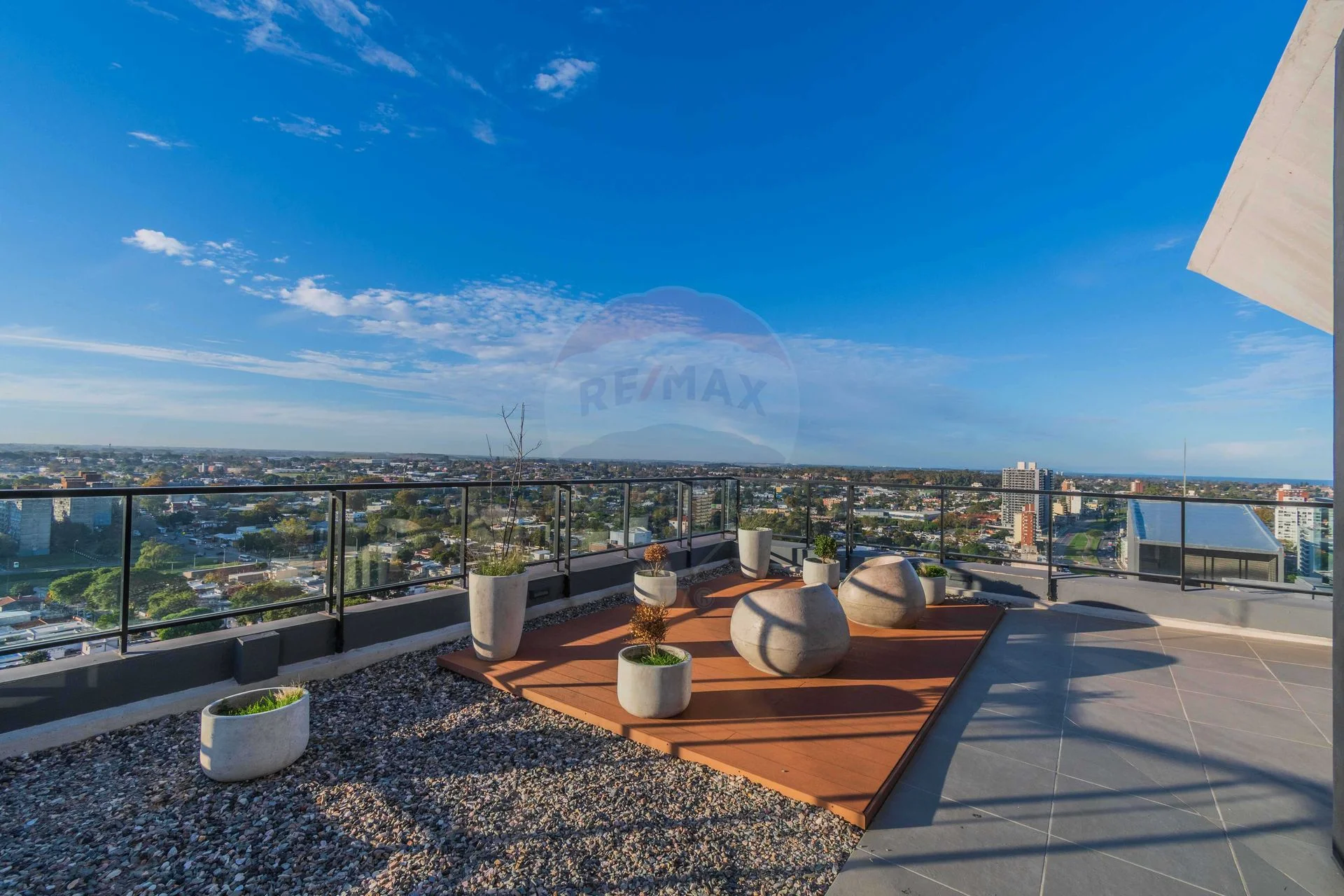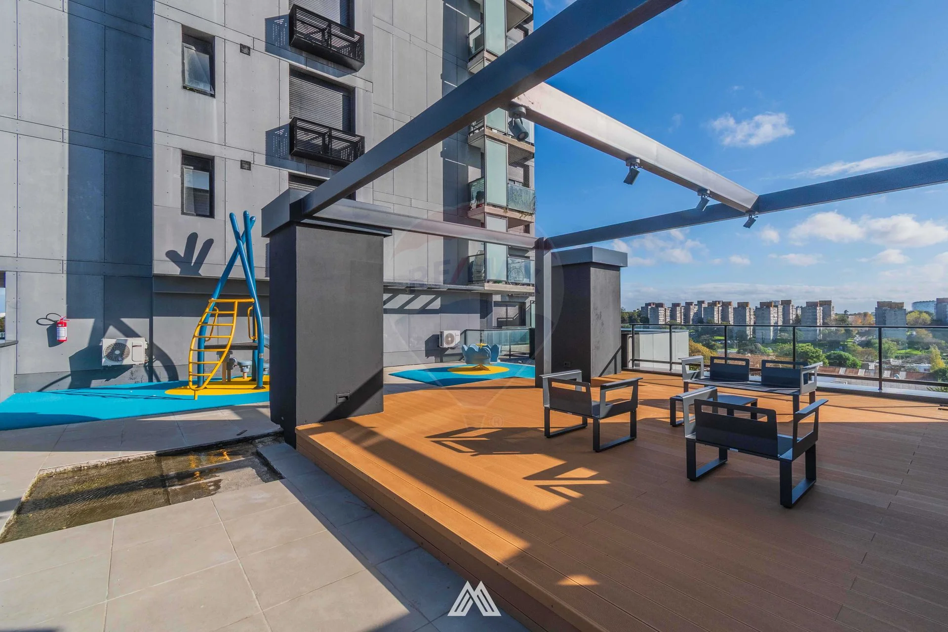 - Espacios exteriores con juegos para niños y livings para adultos