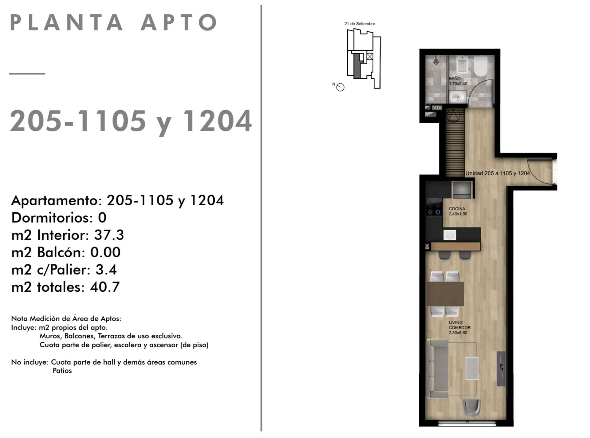 El mismo, se encuentra ubicado sobre la calle 21 de Setiembre esquina Bonpland, en el piso 7 al contrafrente.