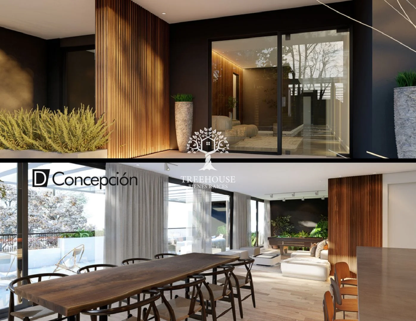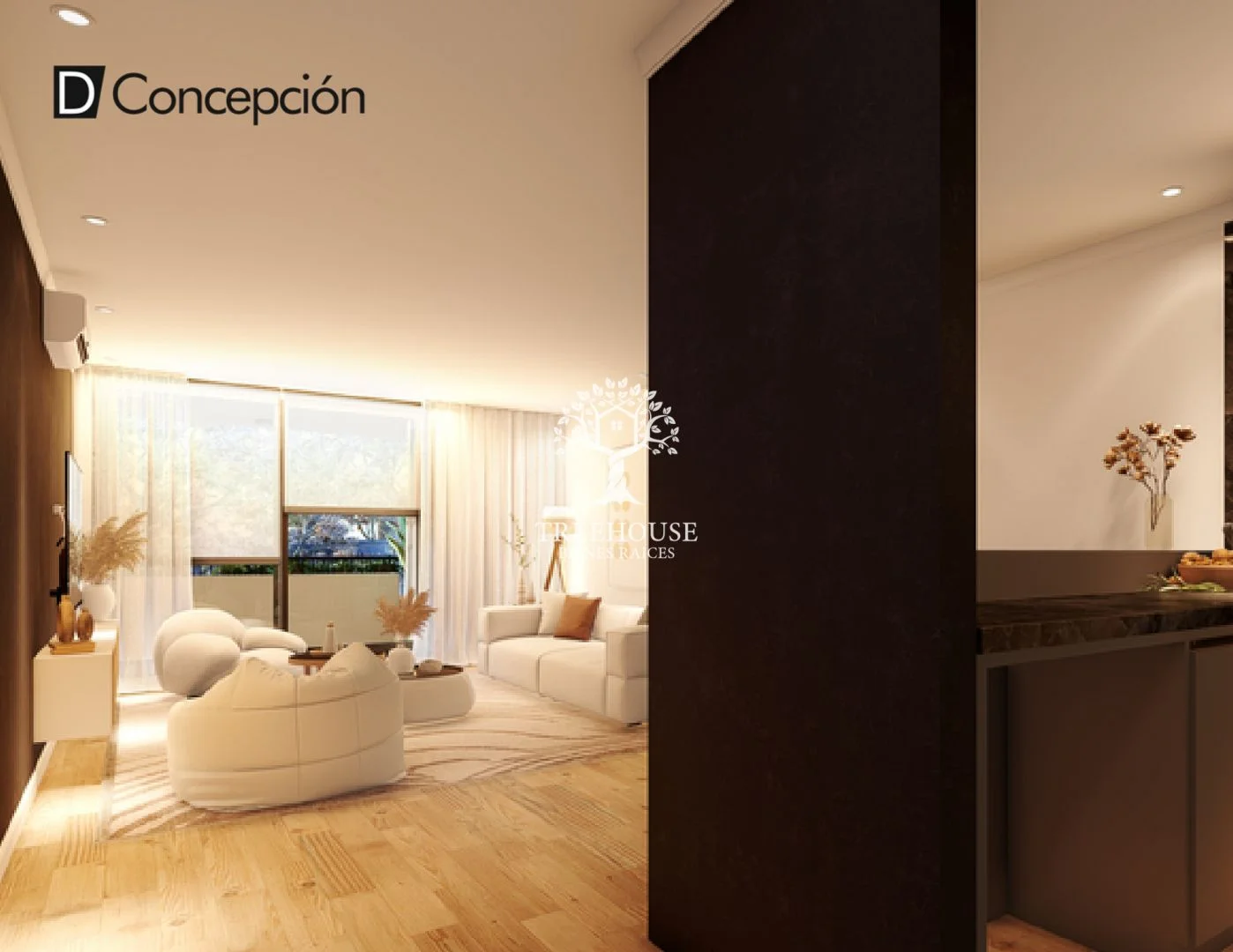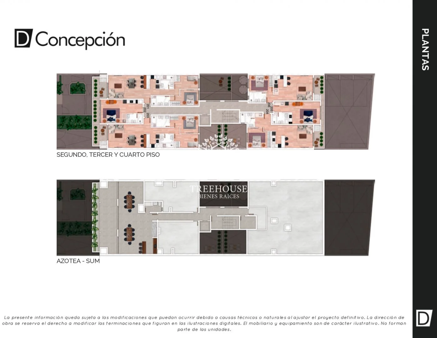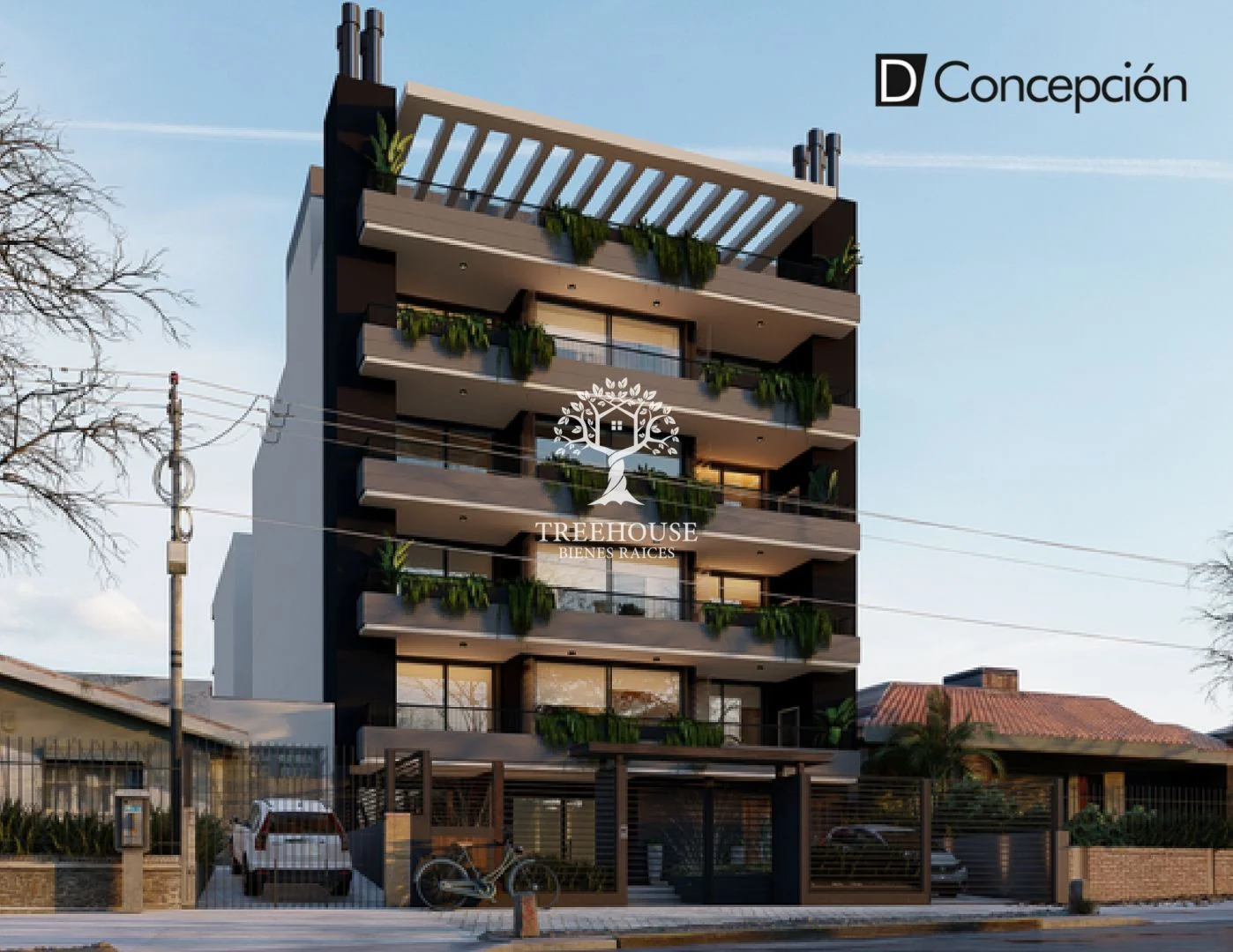Edificio D Concepción: cuenta con 5 pisos, distribuidos en 4 niveles de apartamentos, sumando un total de 26 unidades. Además, dispone de 10 cocheras cubiertas. En el quinto piso, podrán disfrutar de una barbacoa cerrada de uso común.
