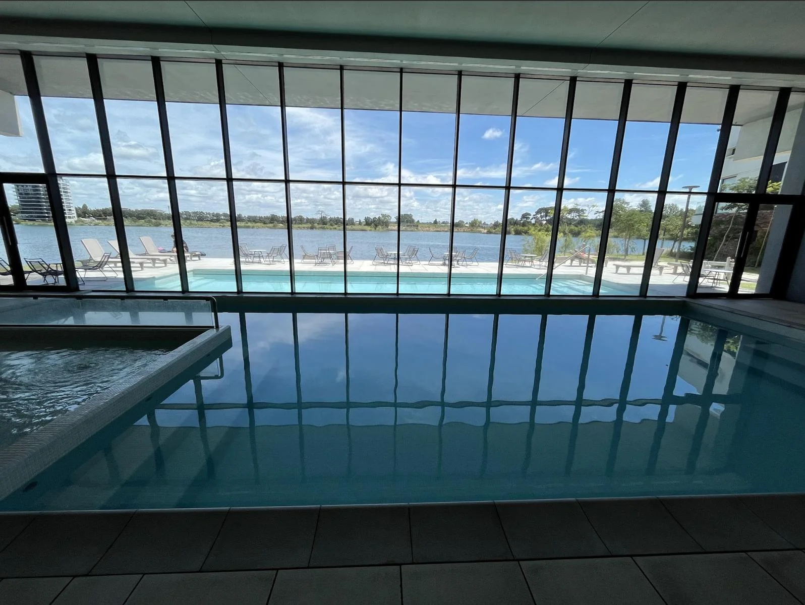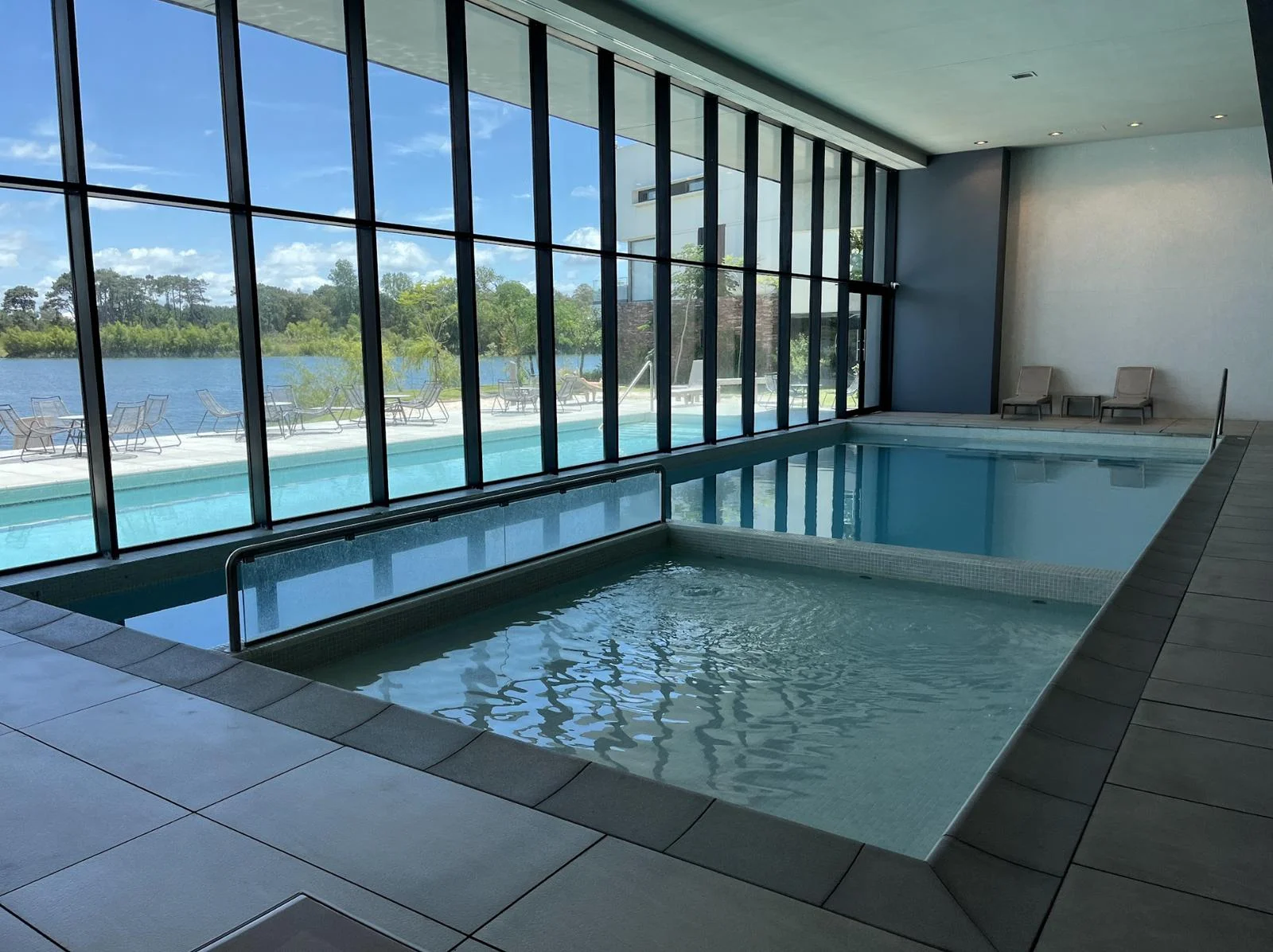 Piscina exterior con solarium y vistas al Lago