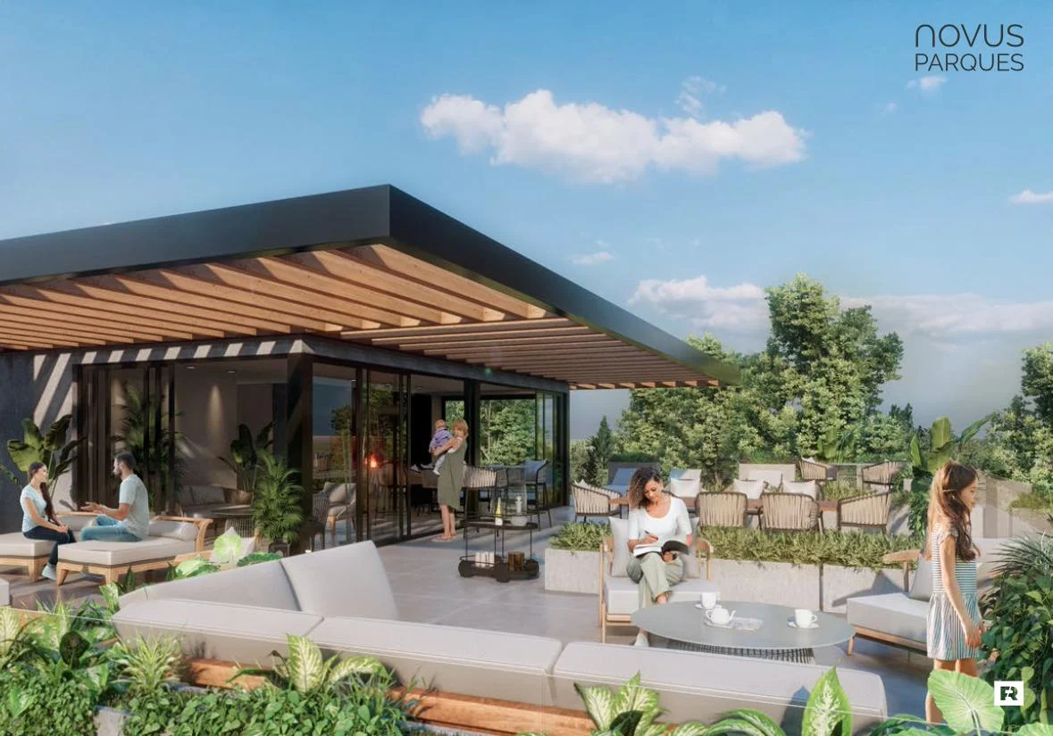 Un pequeño recibidor te guía hacia la sala de estar/comedor, integrados a la cocina con barra, que se extiende a una terraza lavadero. Hay tres dormitorios, uno con vestidor, el principal con vestidor y baño completo en suite. Además, cuenta con un toilette, un baño completo y una terraza que abraza dos lados del apartamento, equipada con un parrillero.