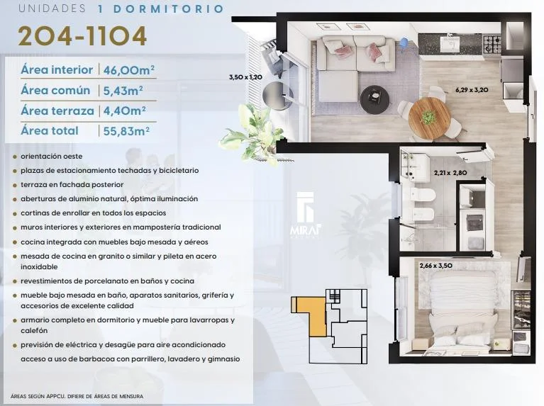 Este atractivo apartamento se compone de una cocina americana que se integra al living comedor, brindando acceso directo a la terraza. Con un baño completo y un cómodo dormitorio, presenta una acogedora orientación oeste, ideal para disfrutar del sol de la tarde.