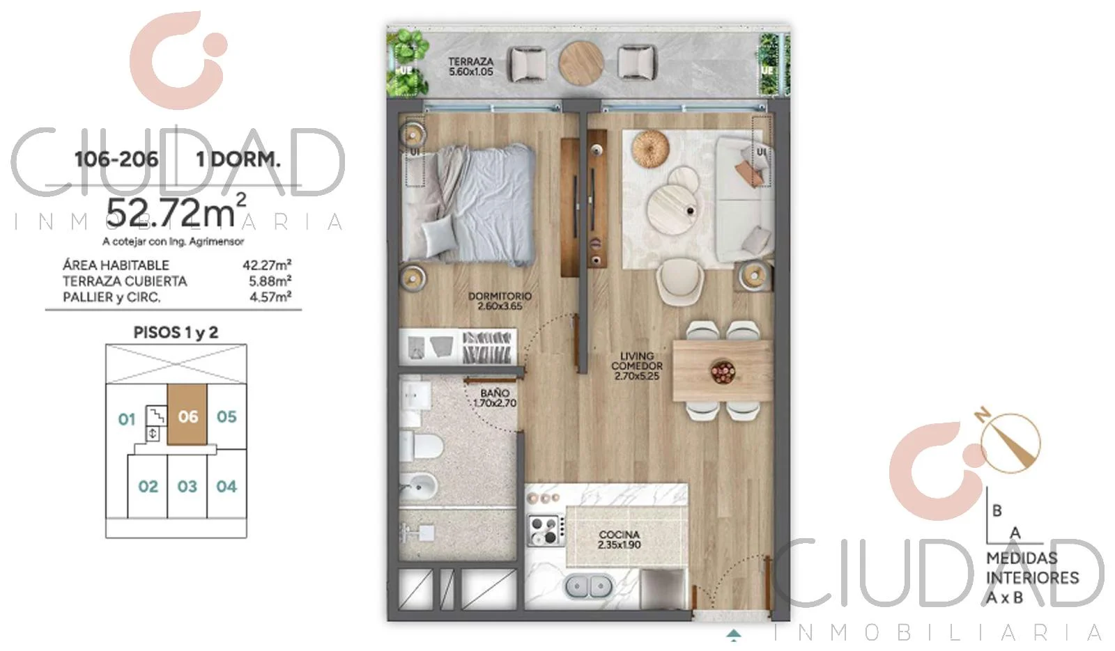 VENTA APARTAMENTO DE UN DORMITORIO, con terraza, cocina integrada con anafe, horno y campana, baño completo.