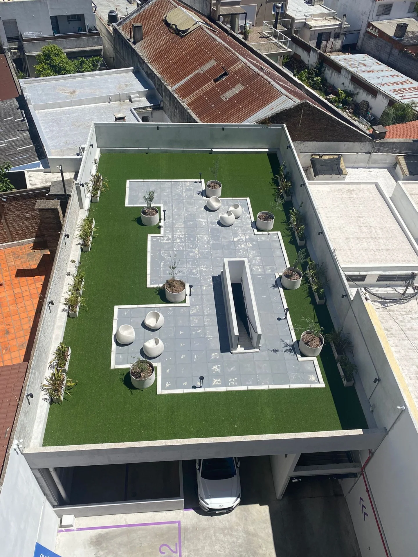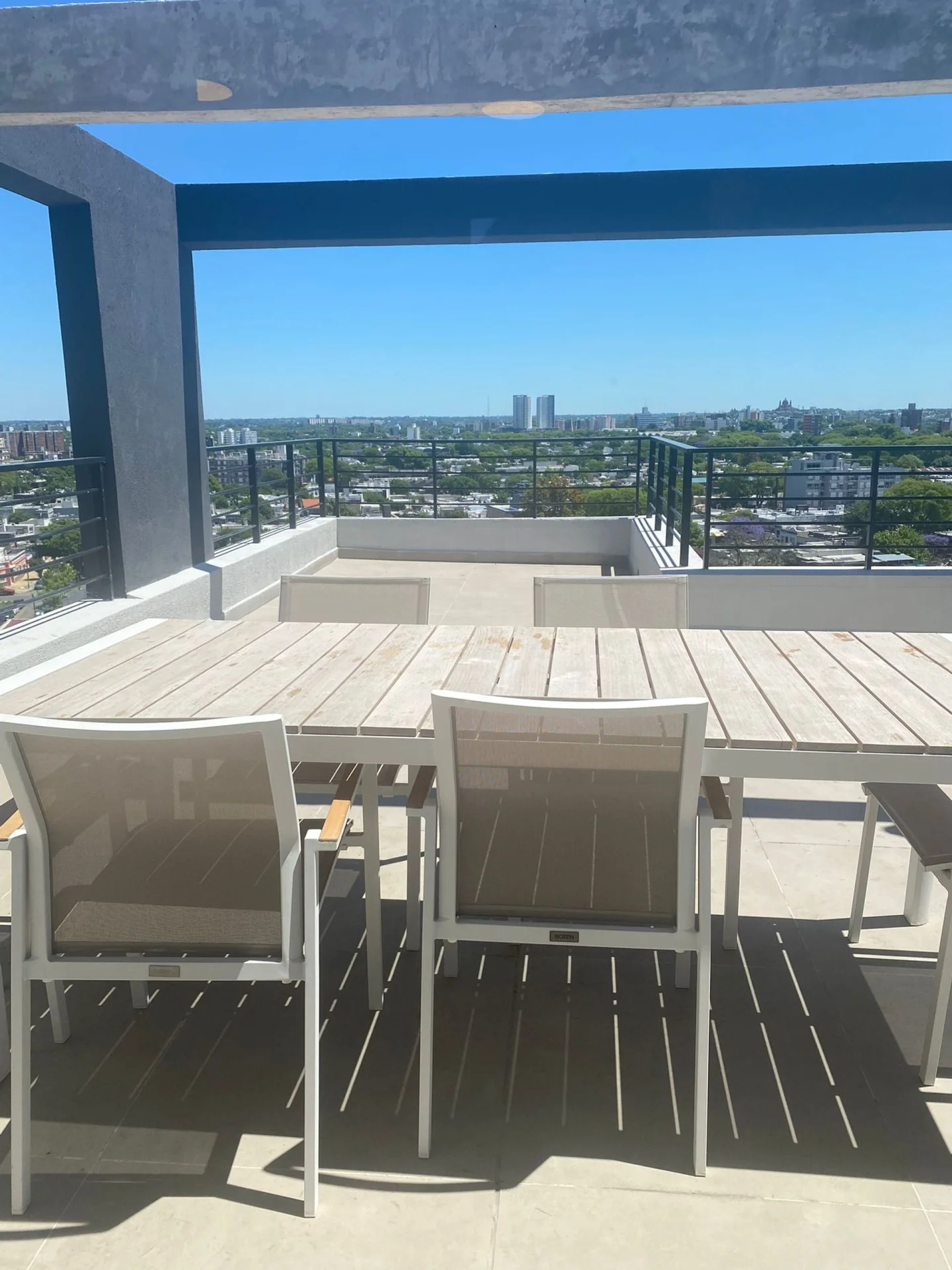 Rooftop con parrilleros abiertos y vista panorámica de la ciudad.