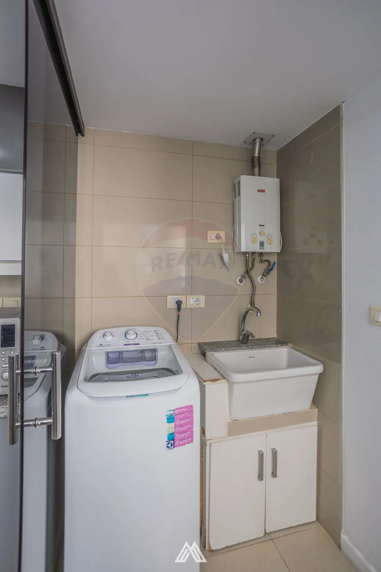 Cocina de muy buen tamaño con barra para desayunar, doble mesada, dos piletas y mucha capacidad de guardado.