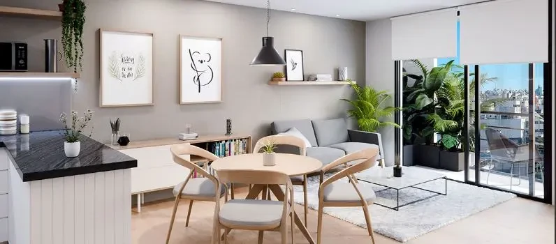 El apartamento presenta una distribución inteligente, donde cada espacio ha sido cuidadosamente diseñado para maximizar el uso del espacio y garantizar la comodidad de sus habitantes. La cocina integrada al living-comedor permite una excelente fluidez en los espacios, creando un ambiente amplio y acogedor.