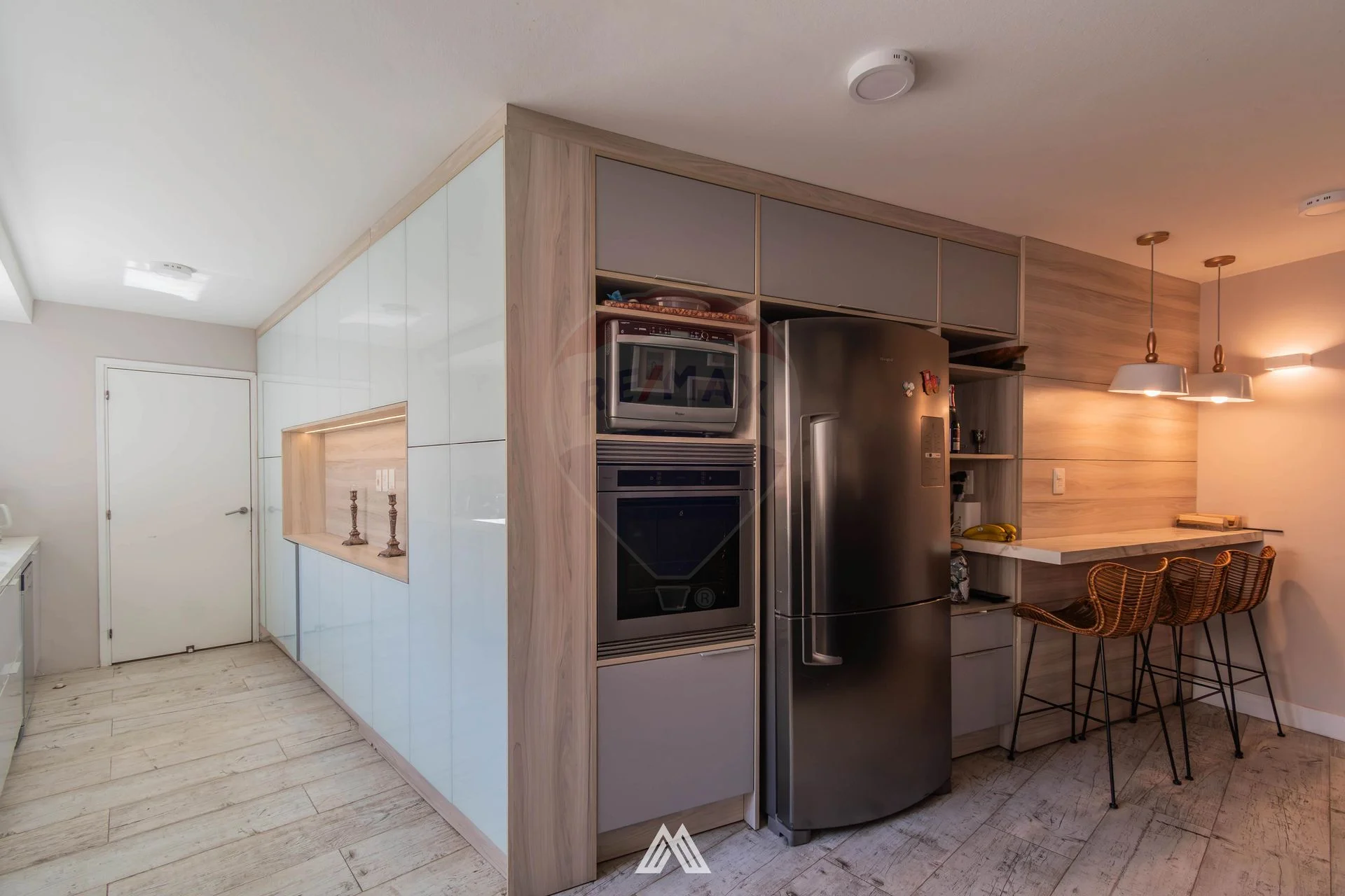 La cocina cuenta con triple mesada placares aeros y bajo mesada, muy cómoda y espaciosa con despensa y mucho espacio de guardado. Esta comunicada con el área de servicio que se hizo barbacoa generando en espacio muy acogedor.