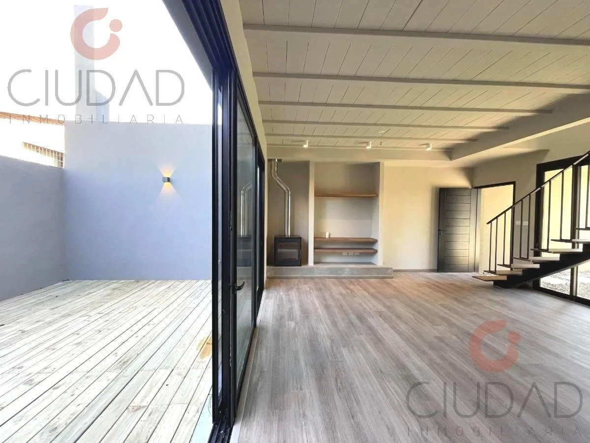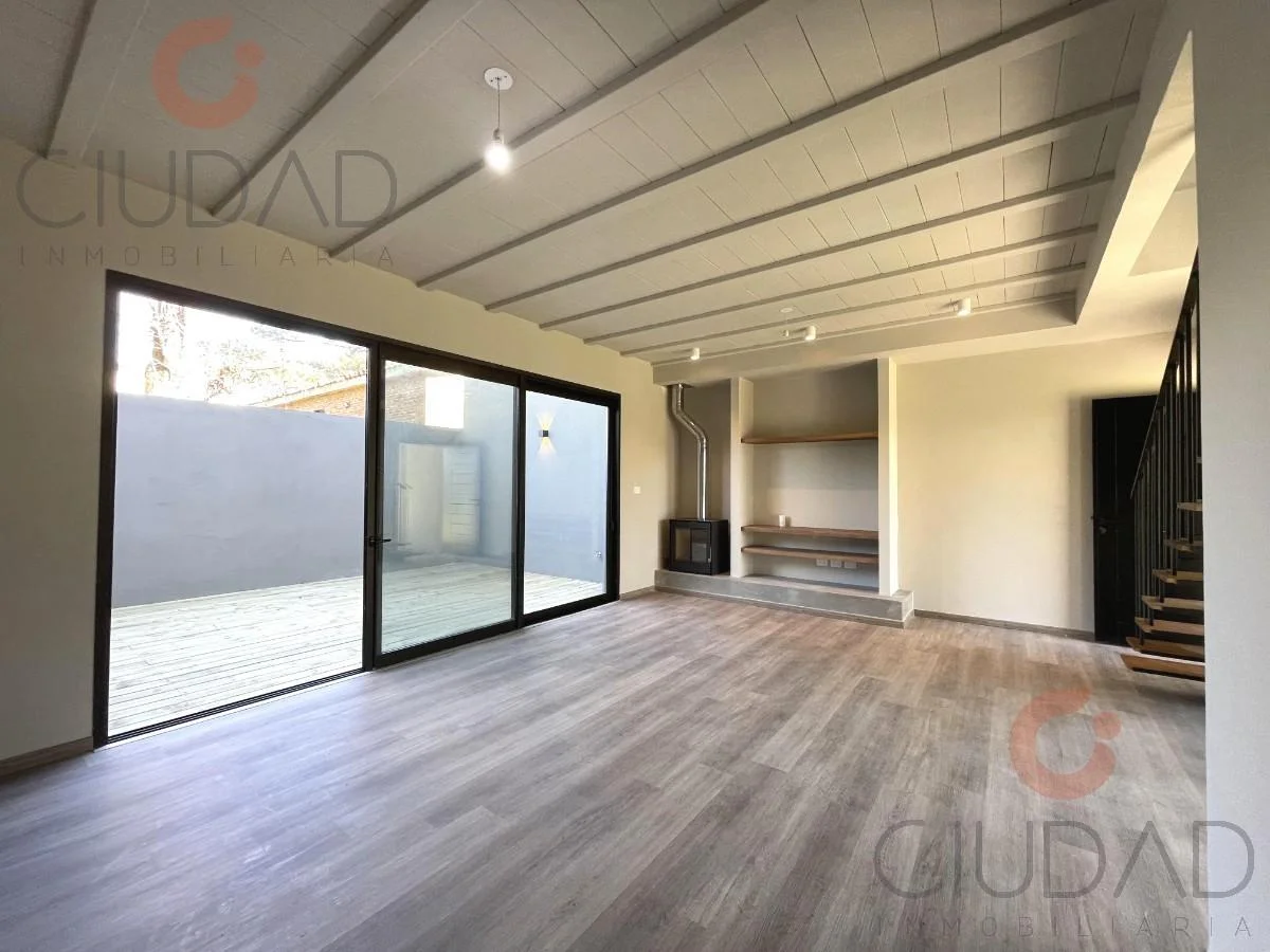 Living comedor con estufa a leña, cocina semi integrada, toilette y salida al jardín.