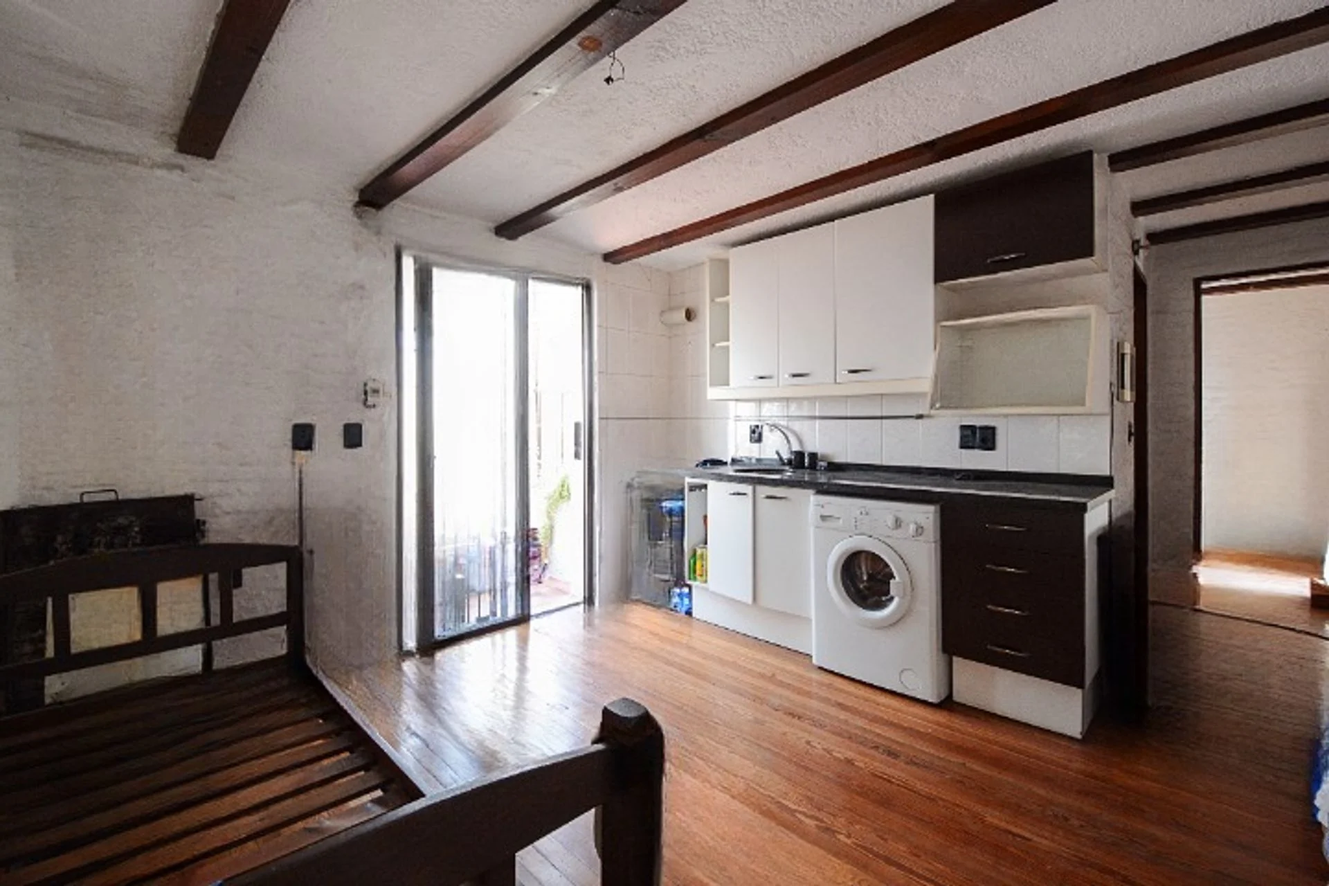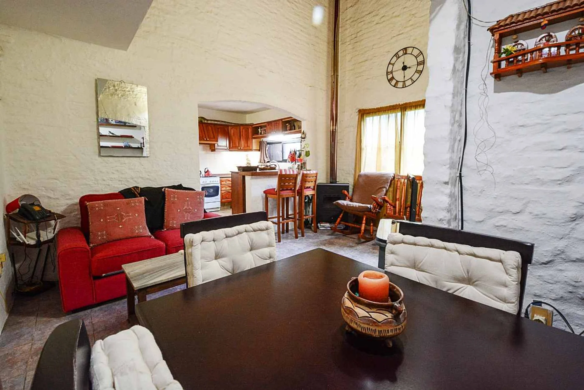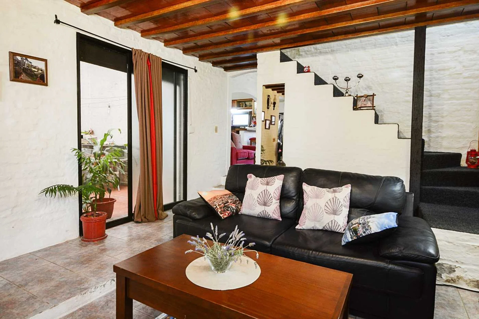 El living posee estufa a leña y ventana hacia uno de los patios, desde allí se accede a la planta alta.