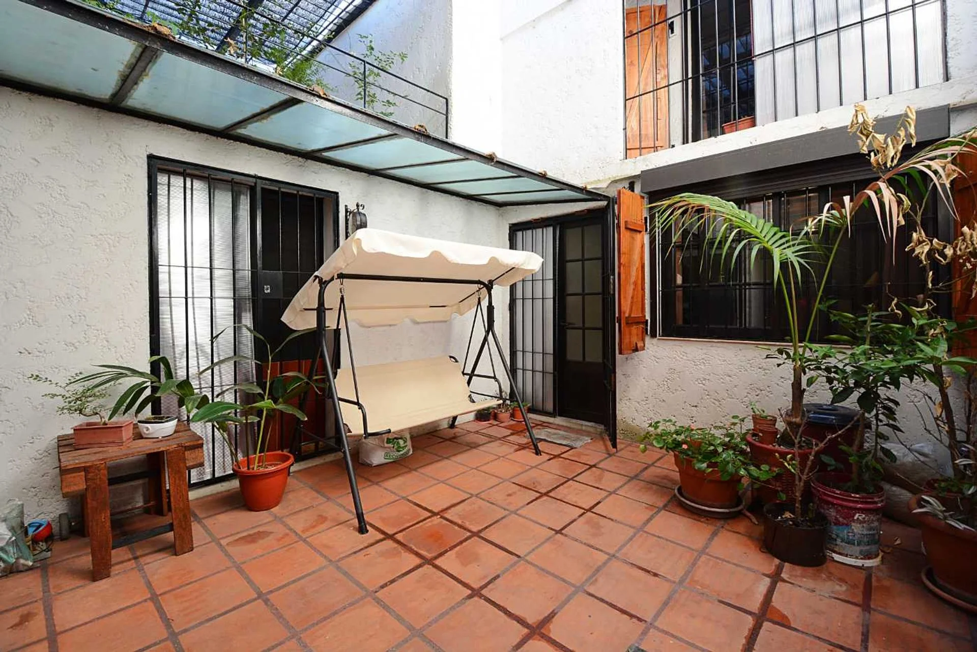 Al ingresar nos encontramos con un hall de distribución que conduce hacia el apartamento dúplex ubicado hacia el frente y a la casa principal, a la cual se accede a través de uno de los patios. El garage es cubierto.