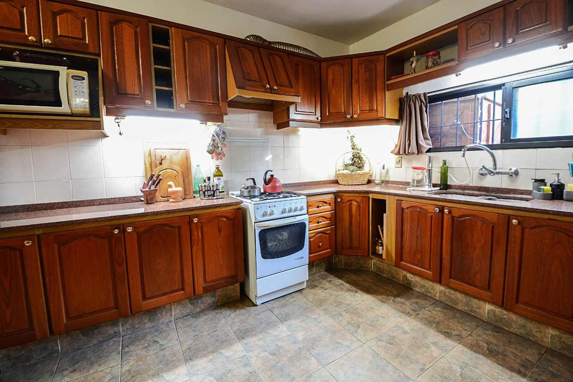 La cocina es espaciosa, semi integrada, tiene salida al patio y la ventana da hacia el jardín. Cuenta con gran cantidad de espacio de guardado en sus muebles aéreos y bajo mesada.