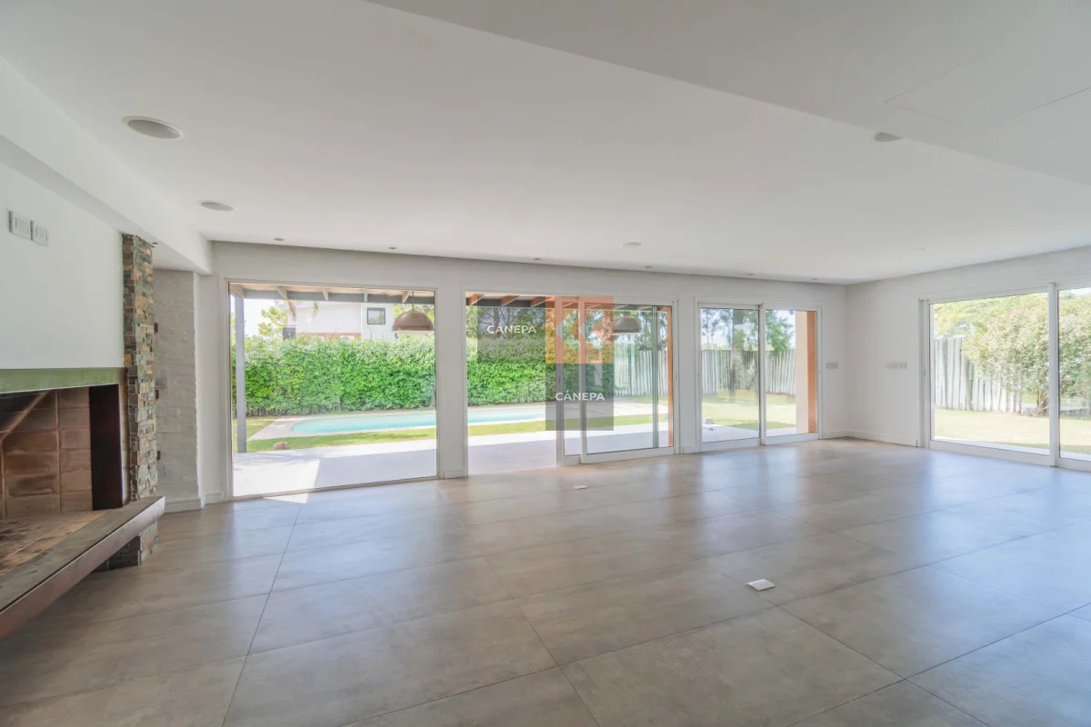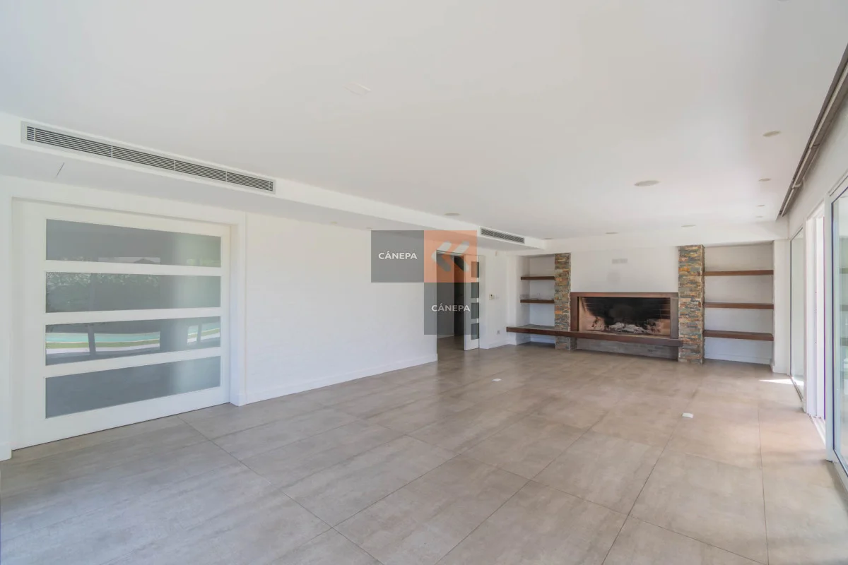Living comedor con estufa a leña y ventanales de piso a techo con salida a gran jardín con piscina