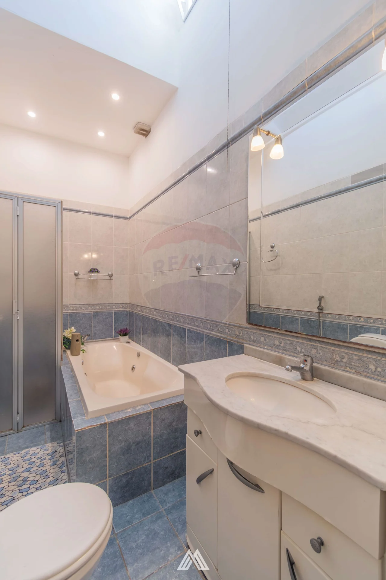 Baño completo con ducha y bañera de hidromasaje.