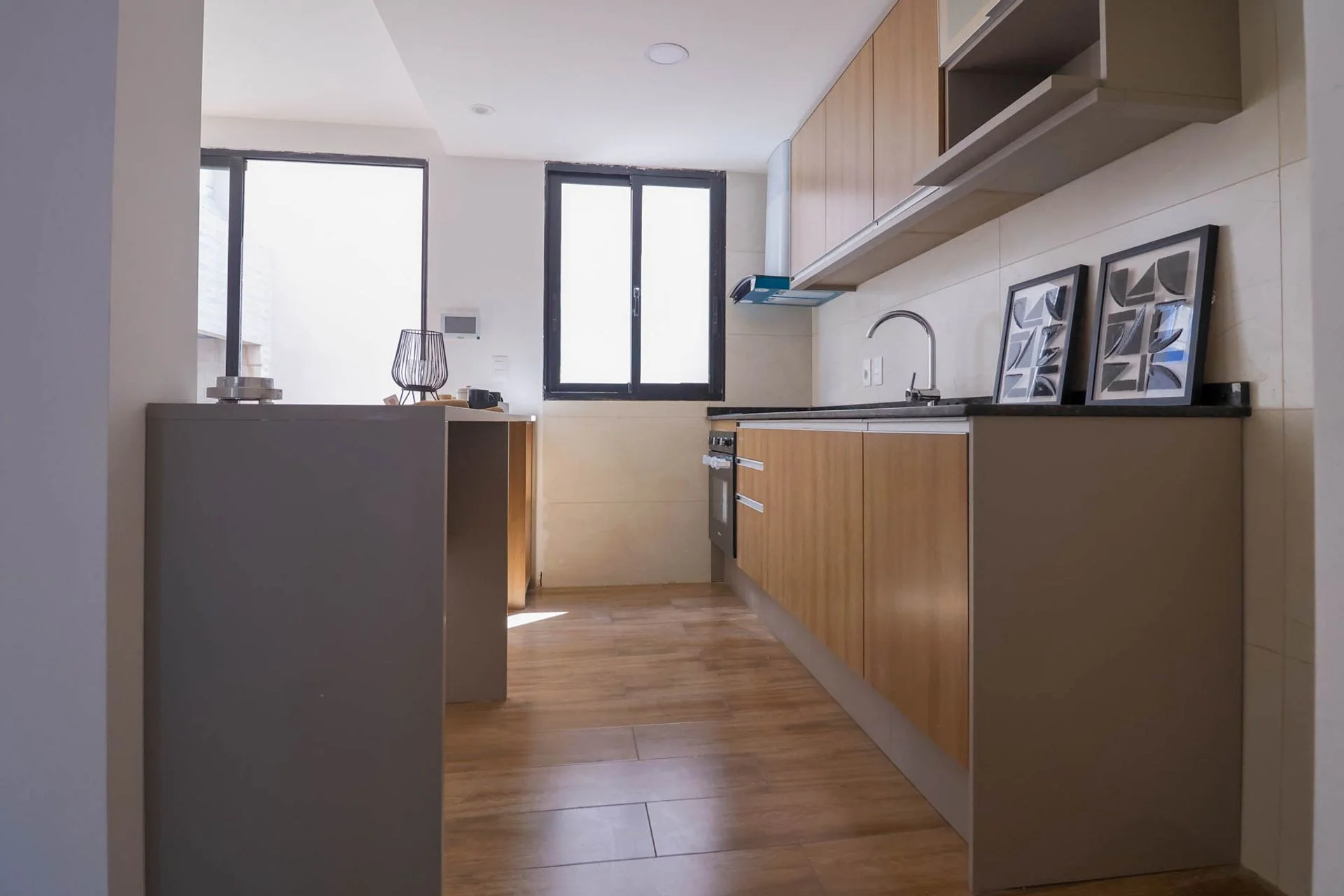 Cocina con barra desayunador, muebles bajo y sobre mesada, equipada con horno , anafe y extracción de aire.