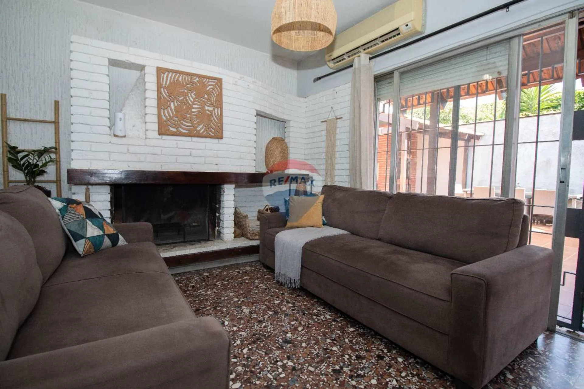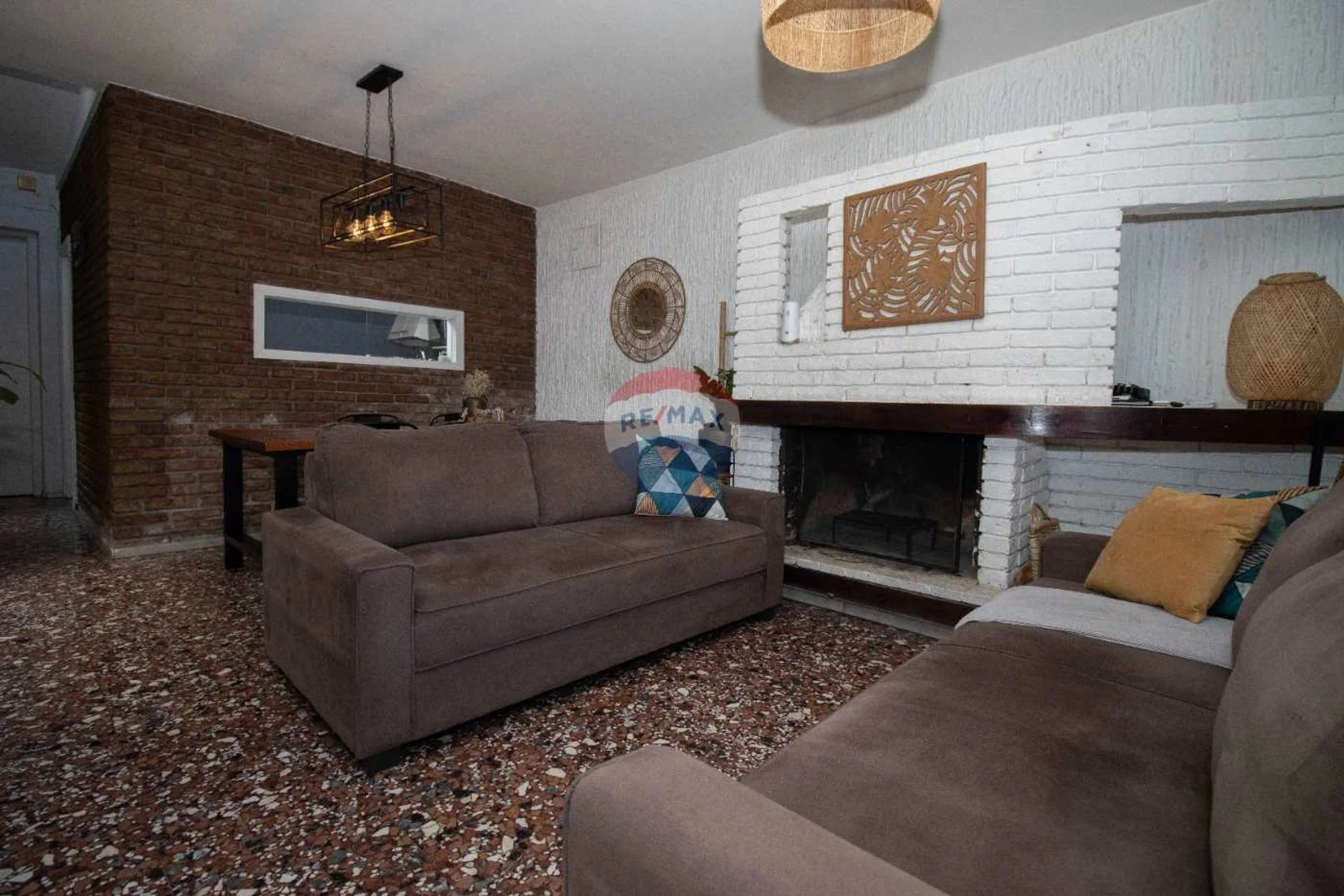 Living comedor amplio con estufa a leña y salida a patio interno y fondo.