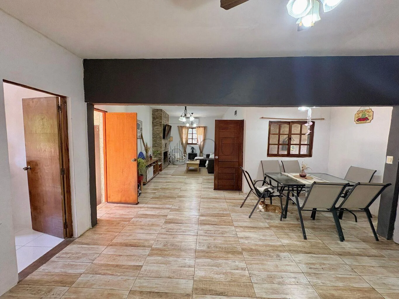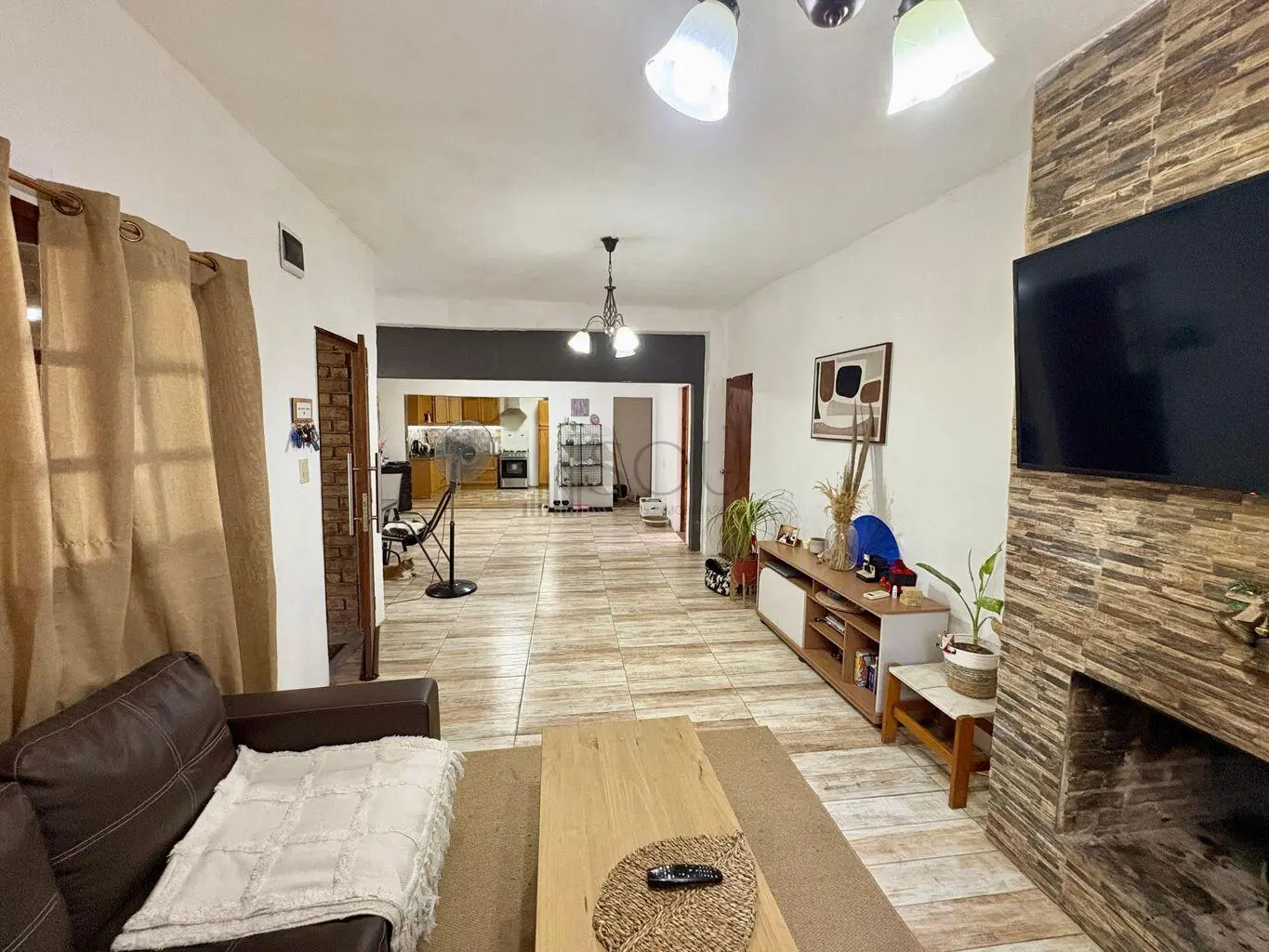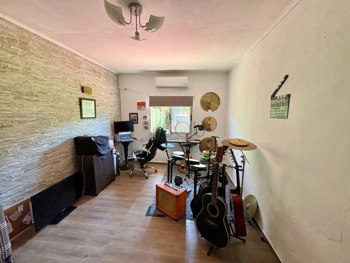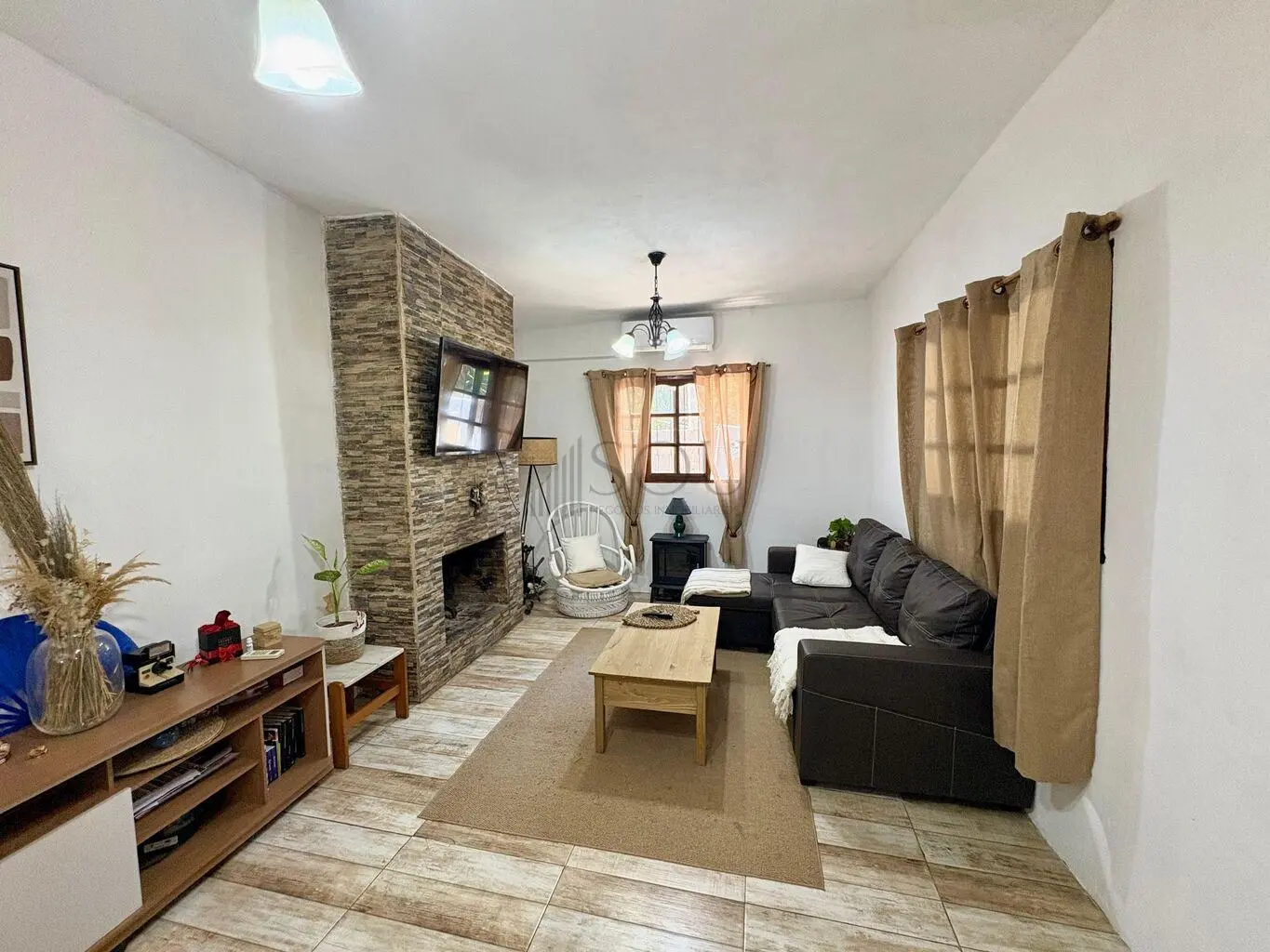 Living con estufa a leña y aire acondicionado.