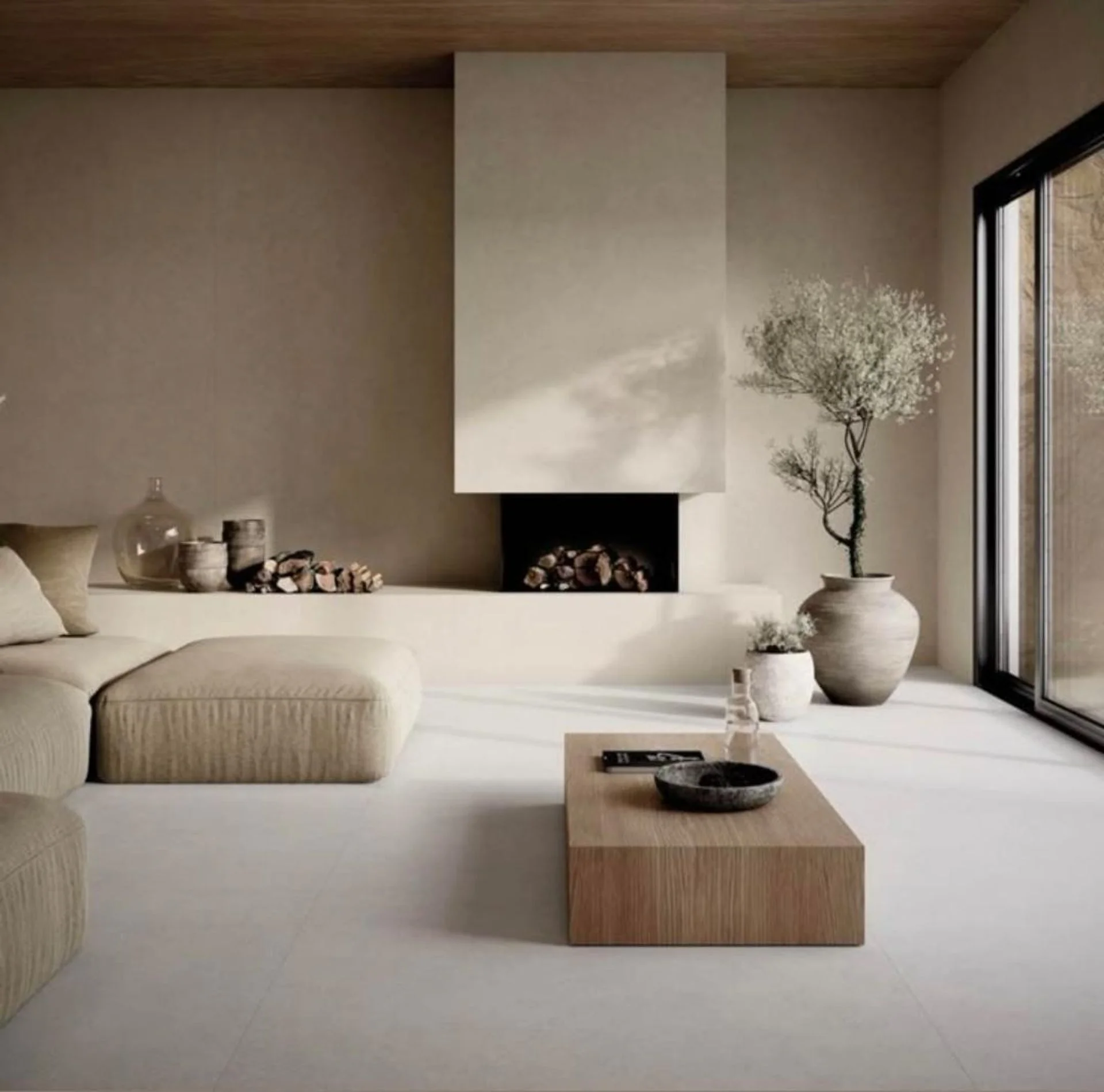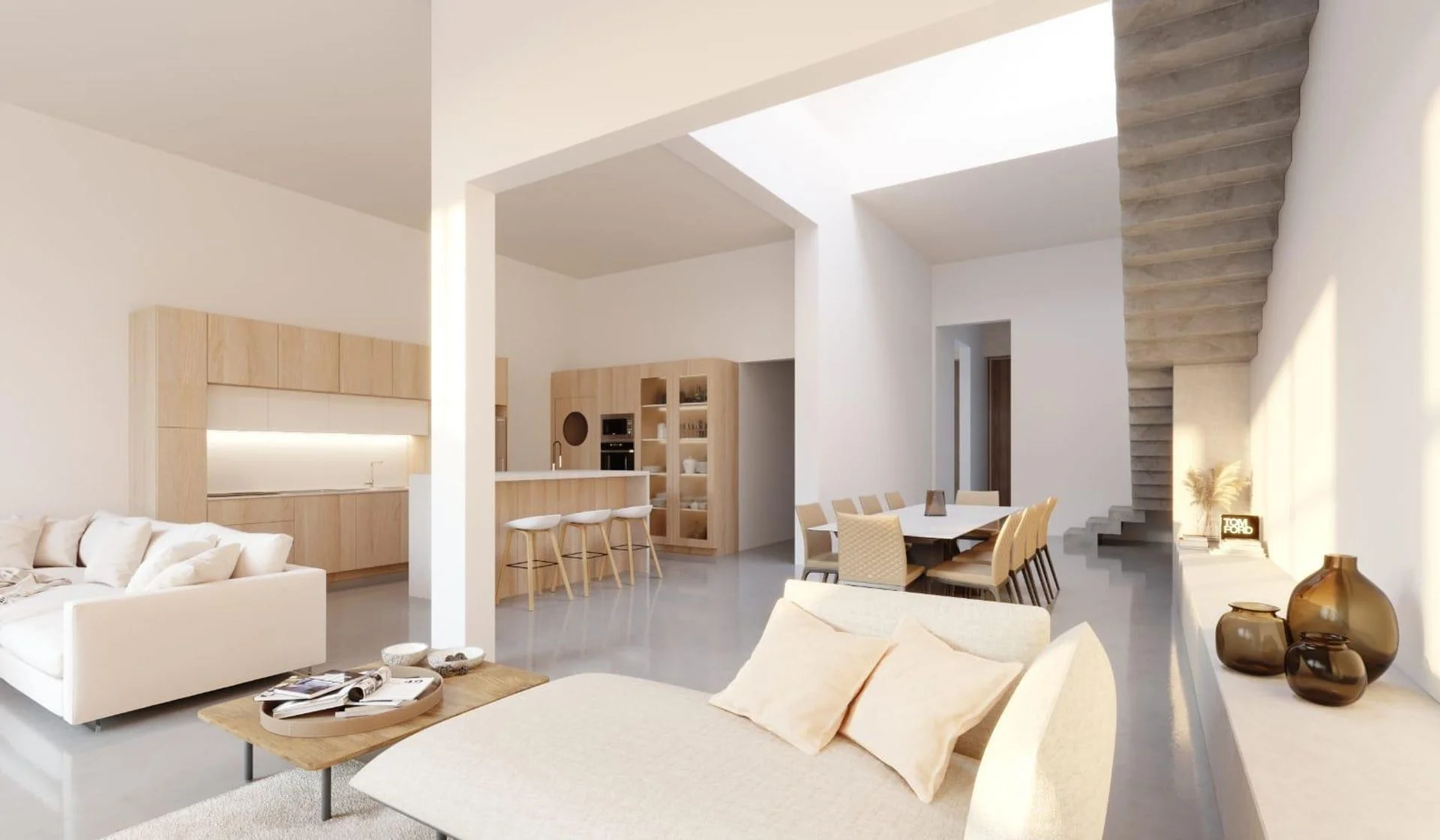 La combinación de madera natural, microcemento y superficies de alta prestación genera un equilibrio entre calidez y modernidad.