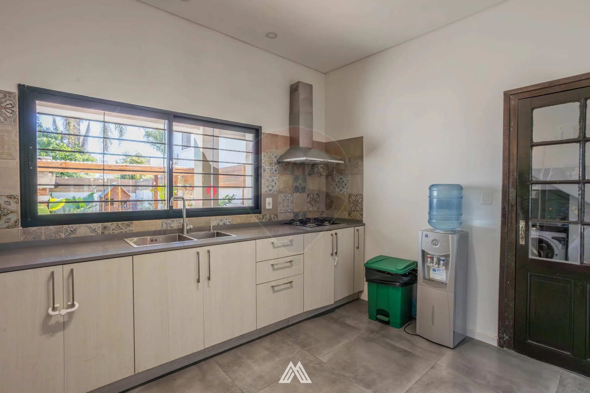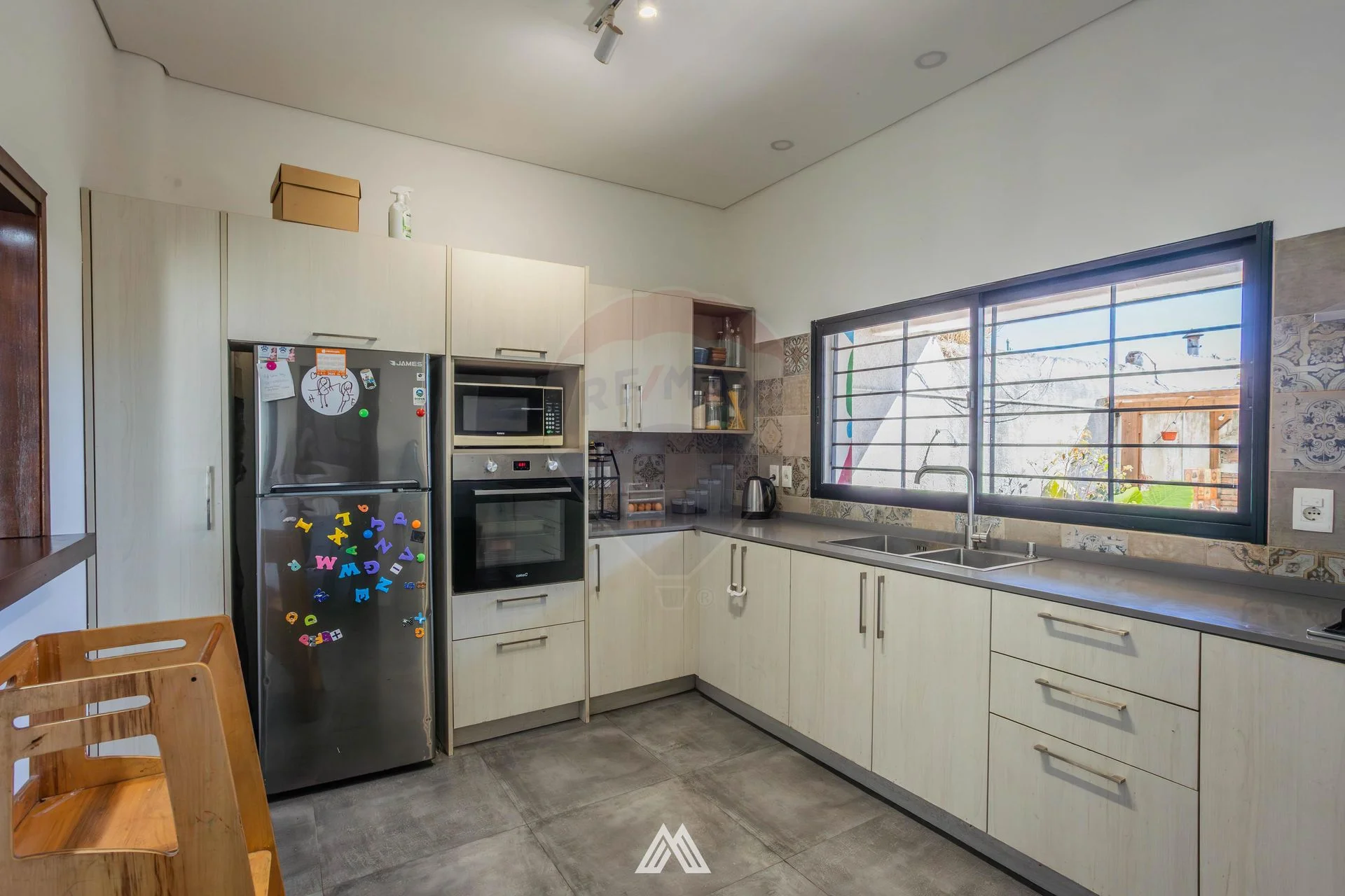 La cocina es semi integrada con una barra desayunadora de madera, muebles aéreos y bajo mesada.
