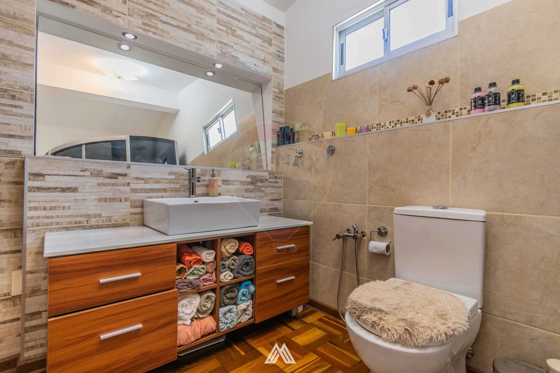 Baño principal con jacuzzi-cabina, construido con materiales de alta calidad como termofusión, cerámica, bacha de cerámica y un mueble con mesada de mármol.