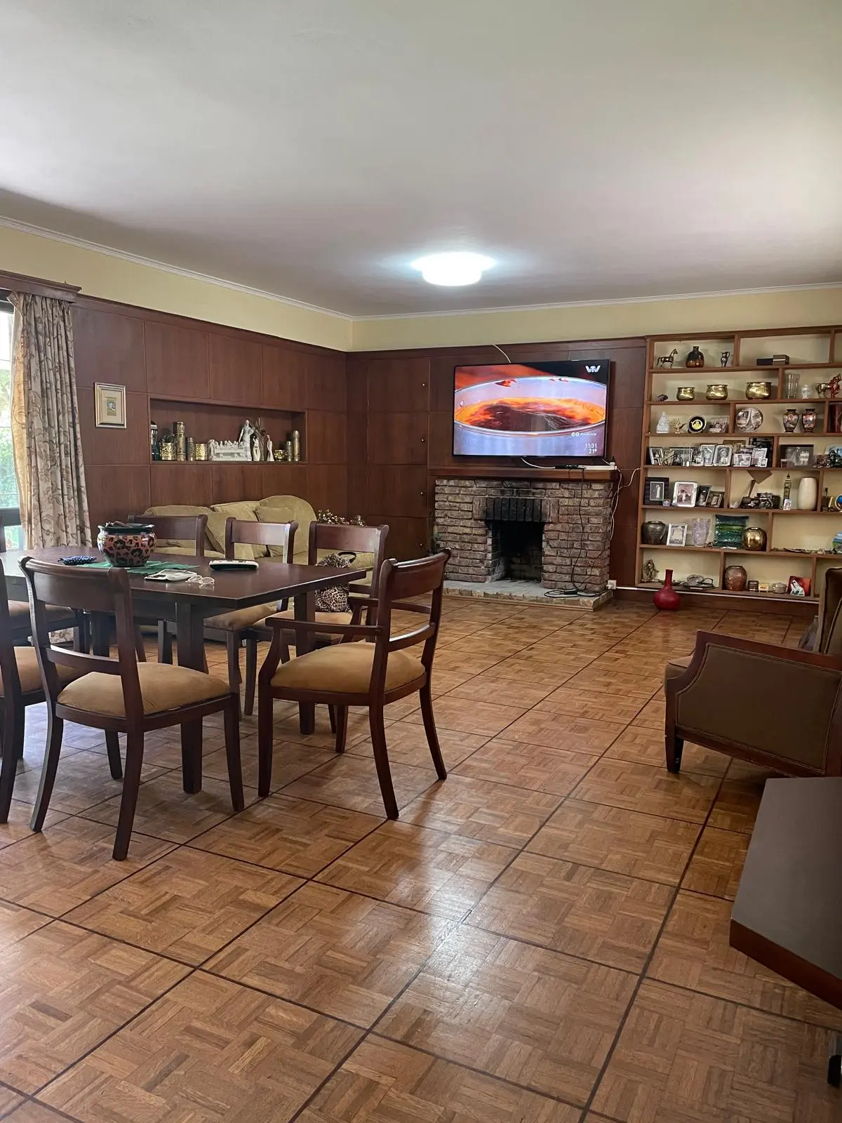 Gran living comedor con hogar y ventanales hacia el fondo.