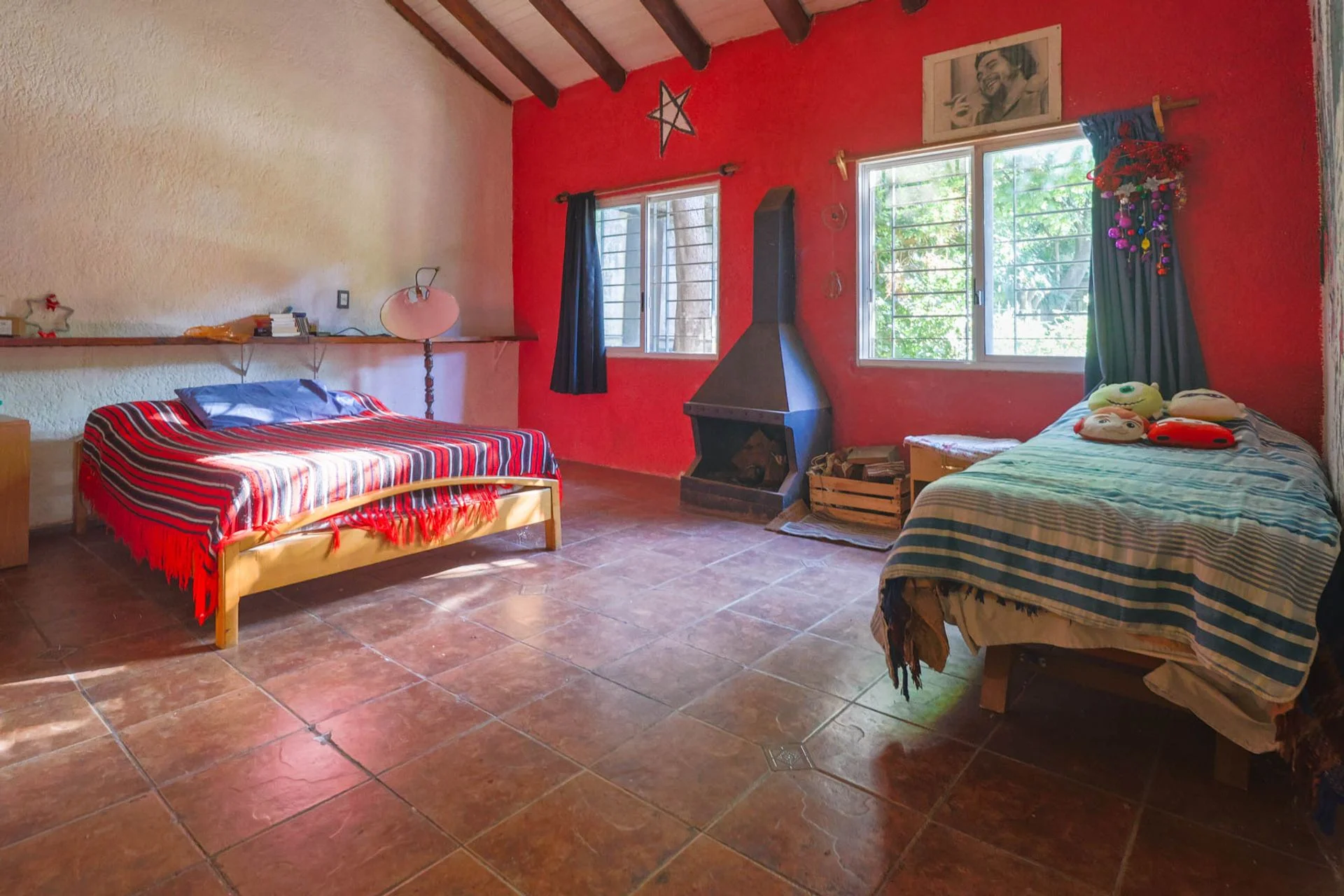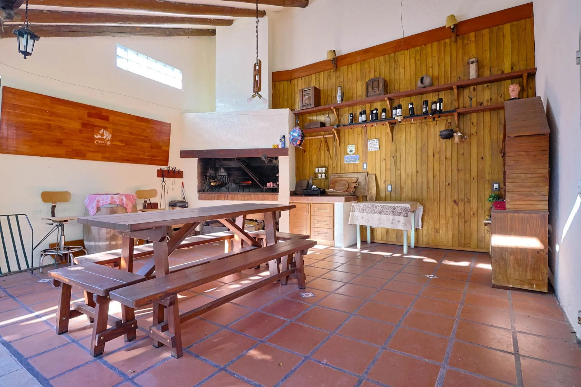 Parrillero semicubierto y barbacoa, equipada con cocina, baño completo, estufa a leña y un dormitorio grande, lo que permite su uso como espacio social o de servicio.