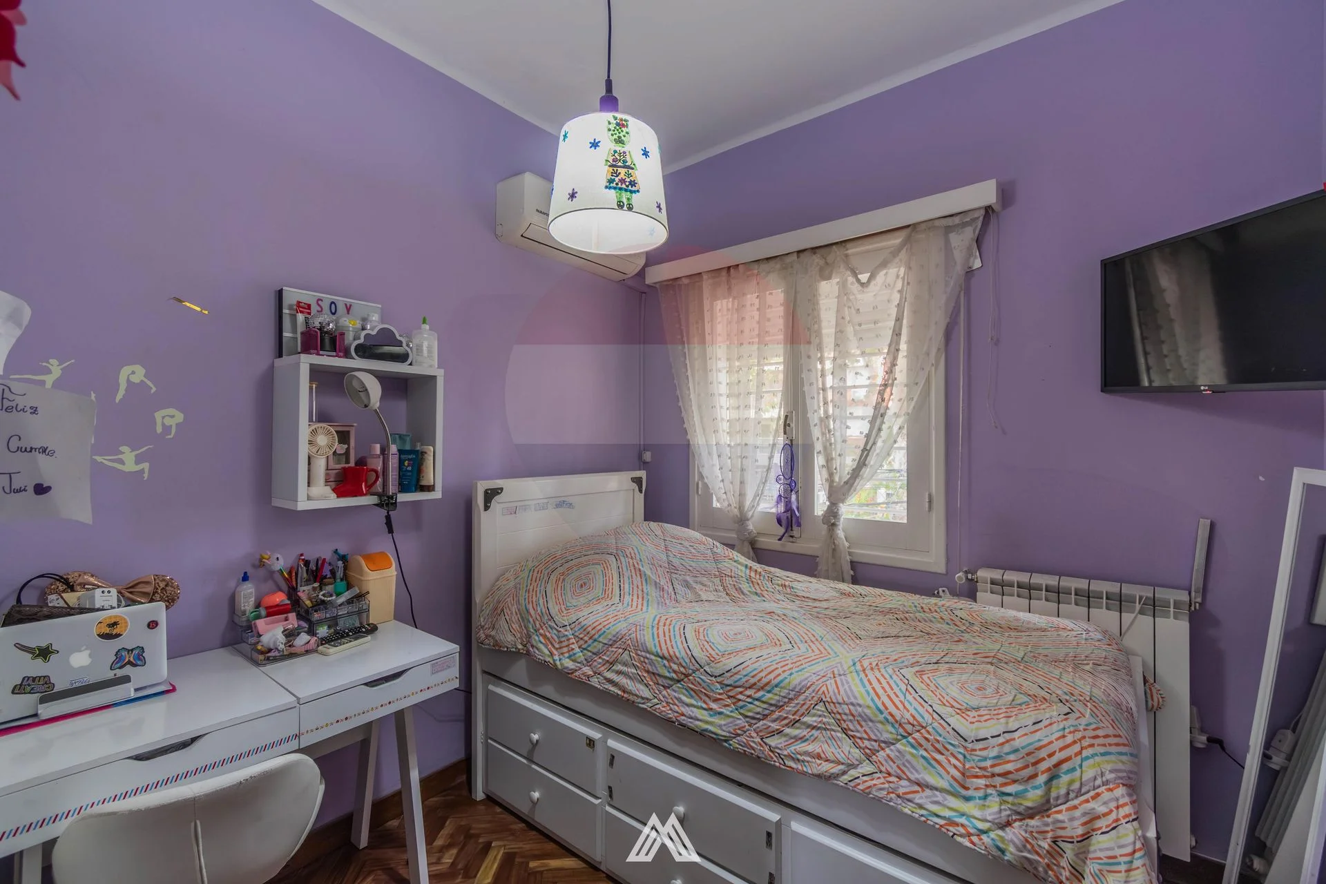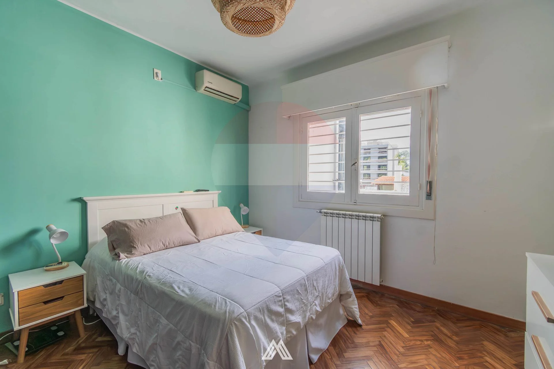 El dormitorio principal con ventana de madera y persiana, orientado al norte, da al patio y tiene baño en suite. Pisos de parquet espigado. Baño principal en esta planta. Todas las aberturas cuentan con rejas.