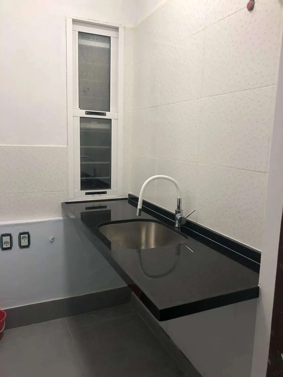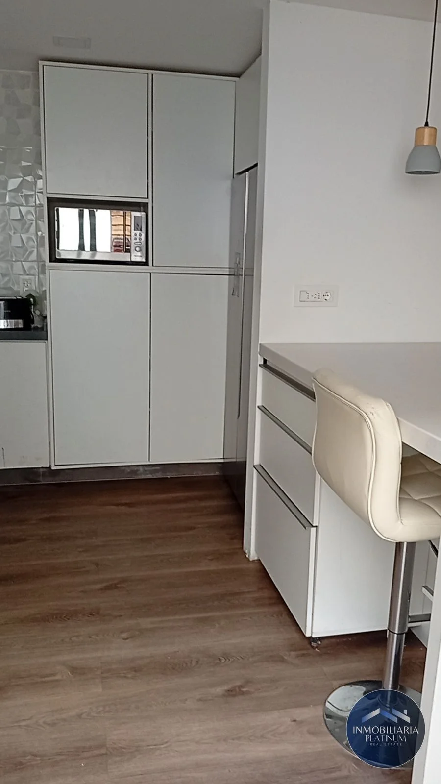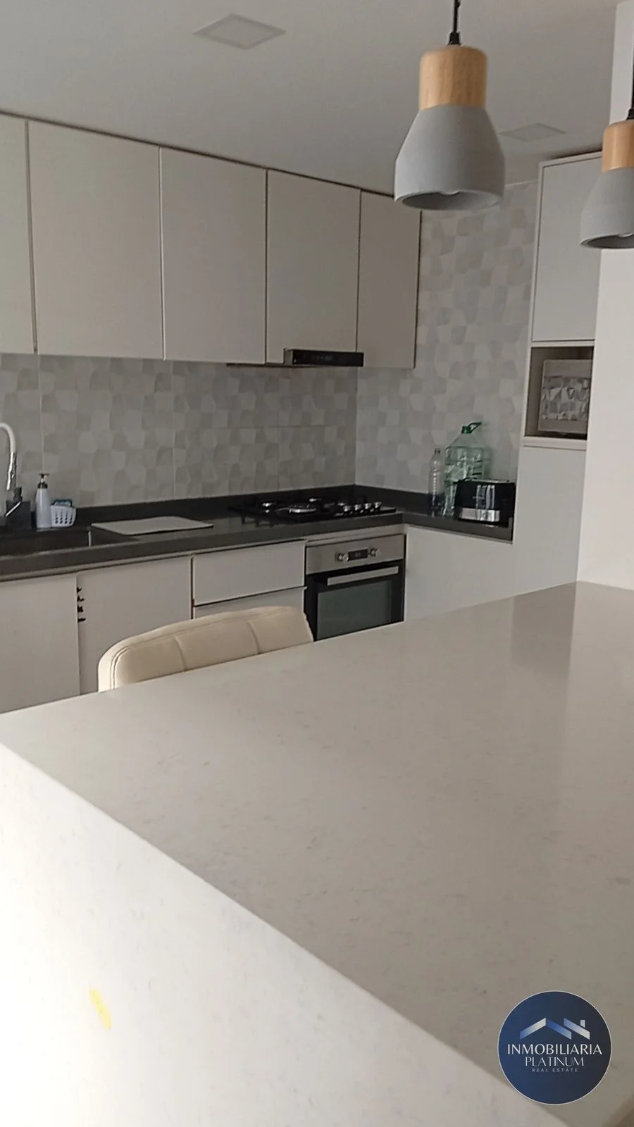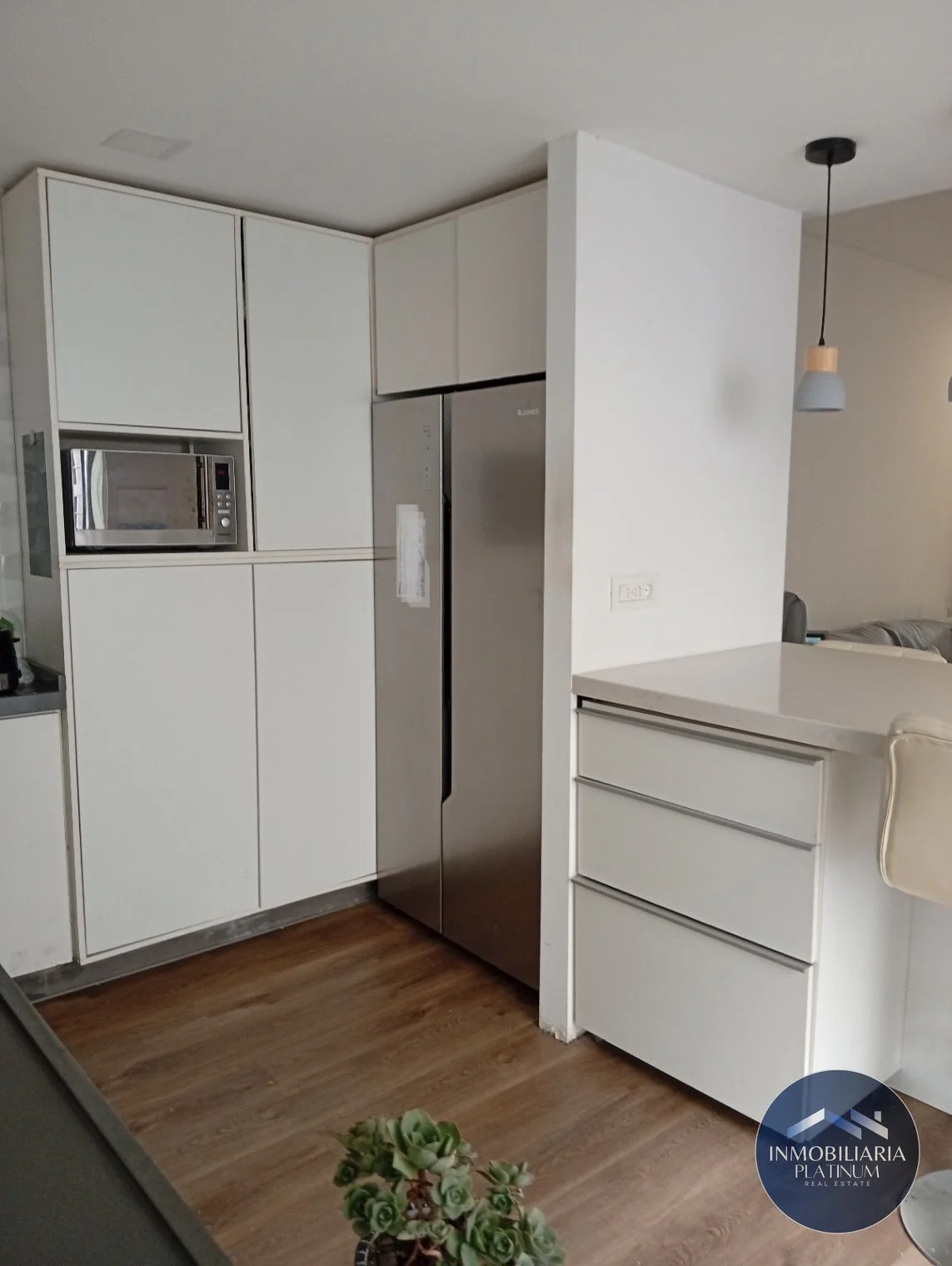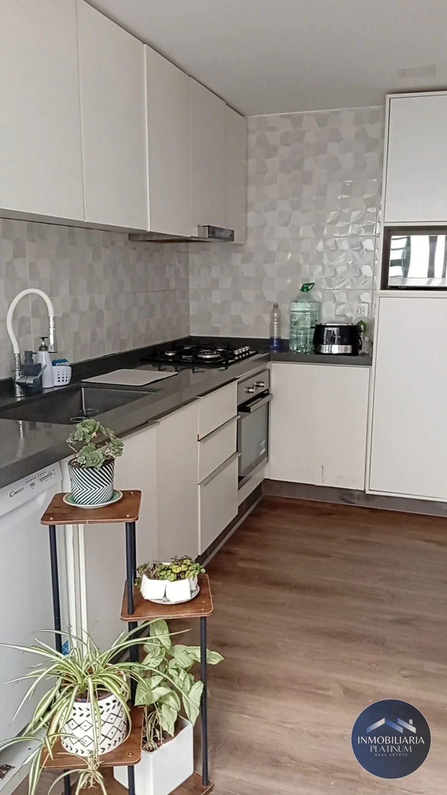 La cocina cuenta con conexión para lavavajillas, una amplia pileta, campana, horno empotrado y anafe. Es cómoda y luminosa con gran capacidad de almacenamiento dada por muebles a medida construidos en melamínico blanco.