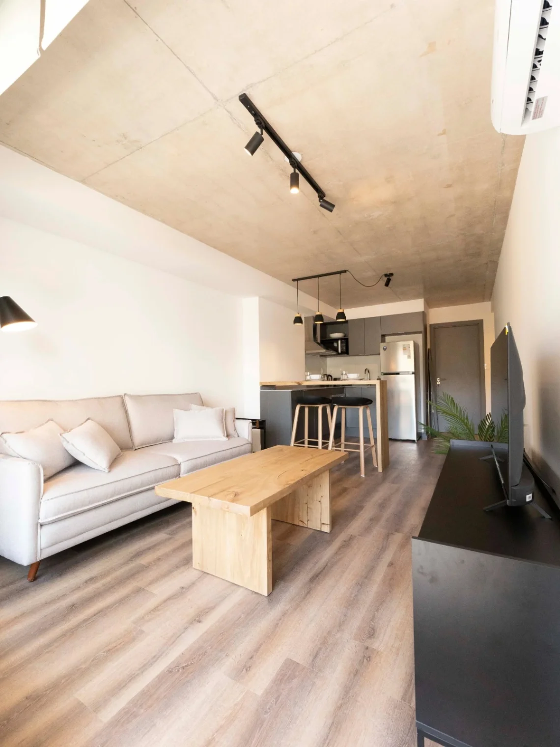 El apartamento incluye un cómodo living comedor con salida a la terraza, una cocina americana equipada con muebles aéreos y bajo mesada, y un dormitorio con placar.