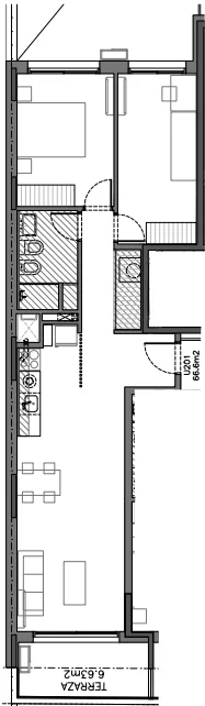 La unidad se encuentra en el sexto piso al frente. Dispone de un luminoso living comedor con salida a terraza y cocina integrada. Los dos dormitorios están orientados al contrafrente, lo que garantiza mayor privacidad y tranquilidad.