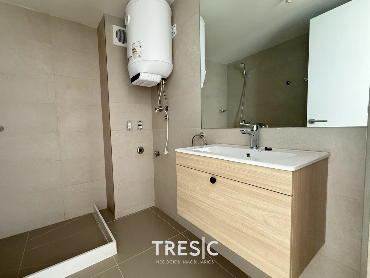 El baño es completo y de generosas dimensiones, equipado con calefón y conexión prevista para lavarropas.