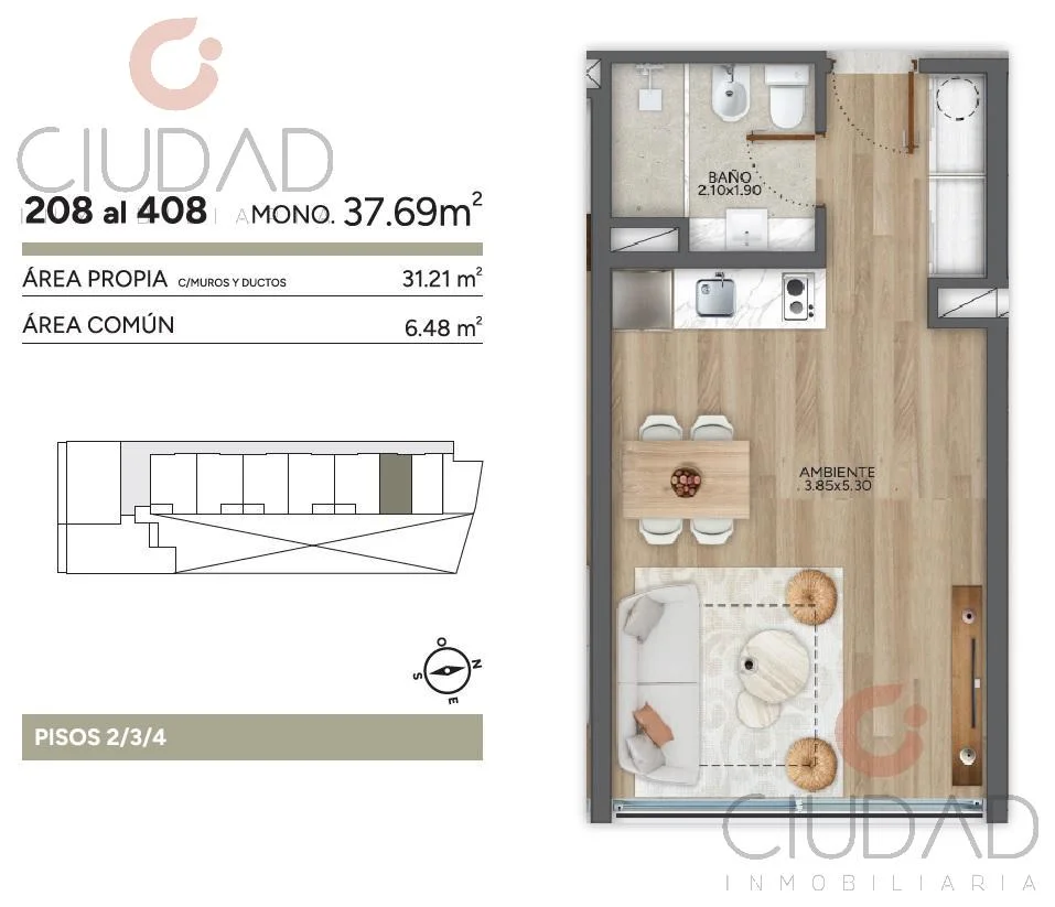 APARTAMENTO: Unidad Monoambiente en piso 2 con: