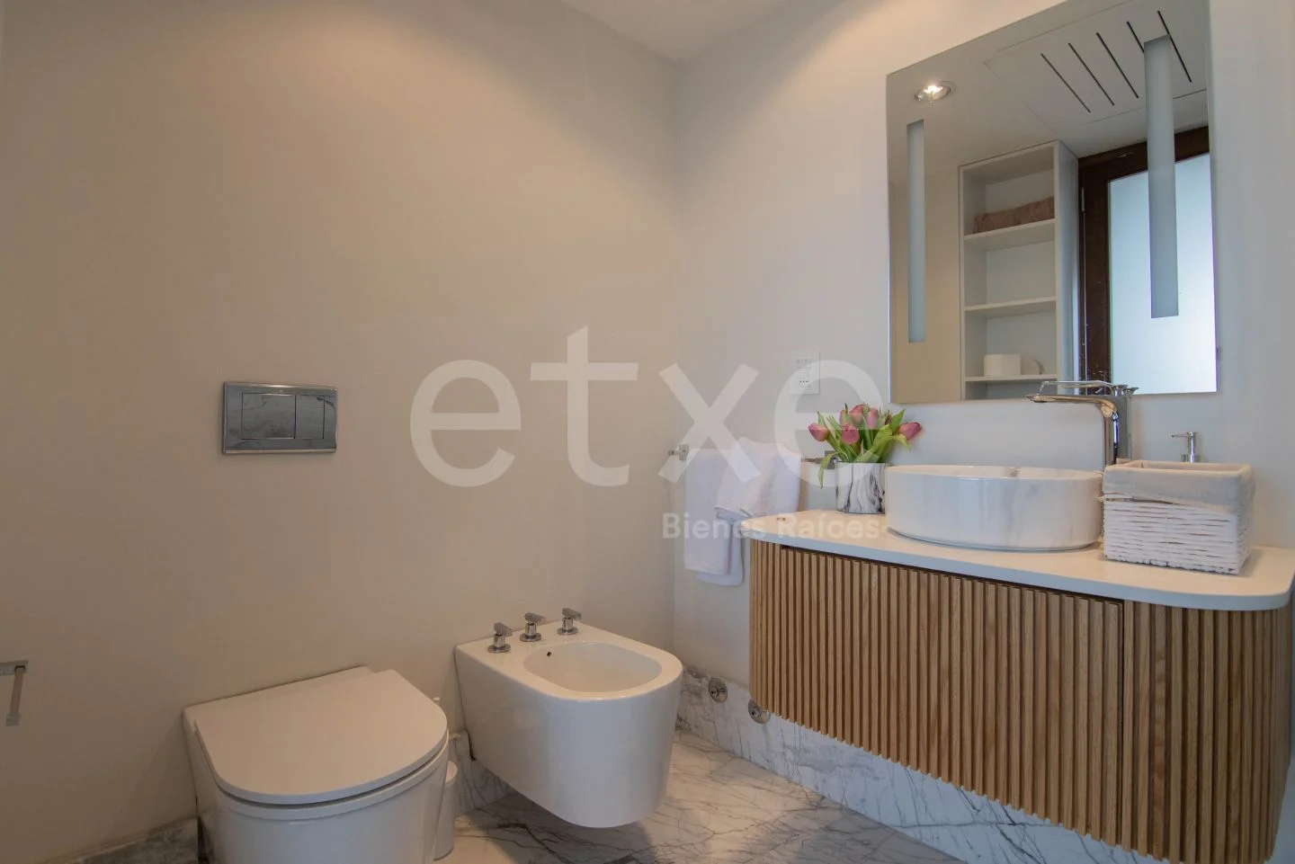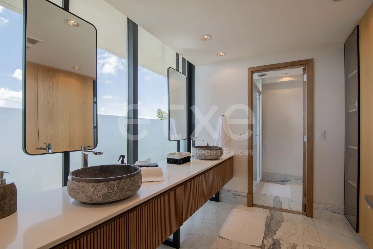 A beautiful iron staircase leads down to the second floor, where a spectacular hall connects to four en-suite bedrooms, each with access to the wraparound terrace. Master bedroom with walk-in closet and compartmentalized bathroom.