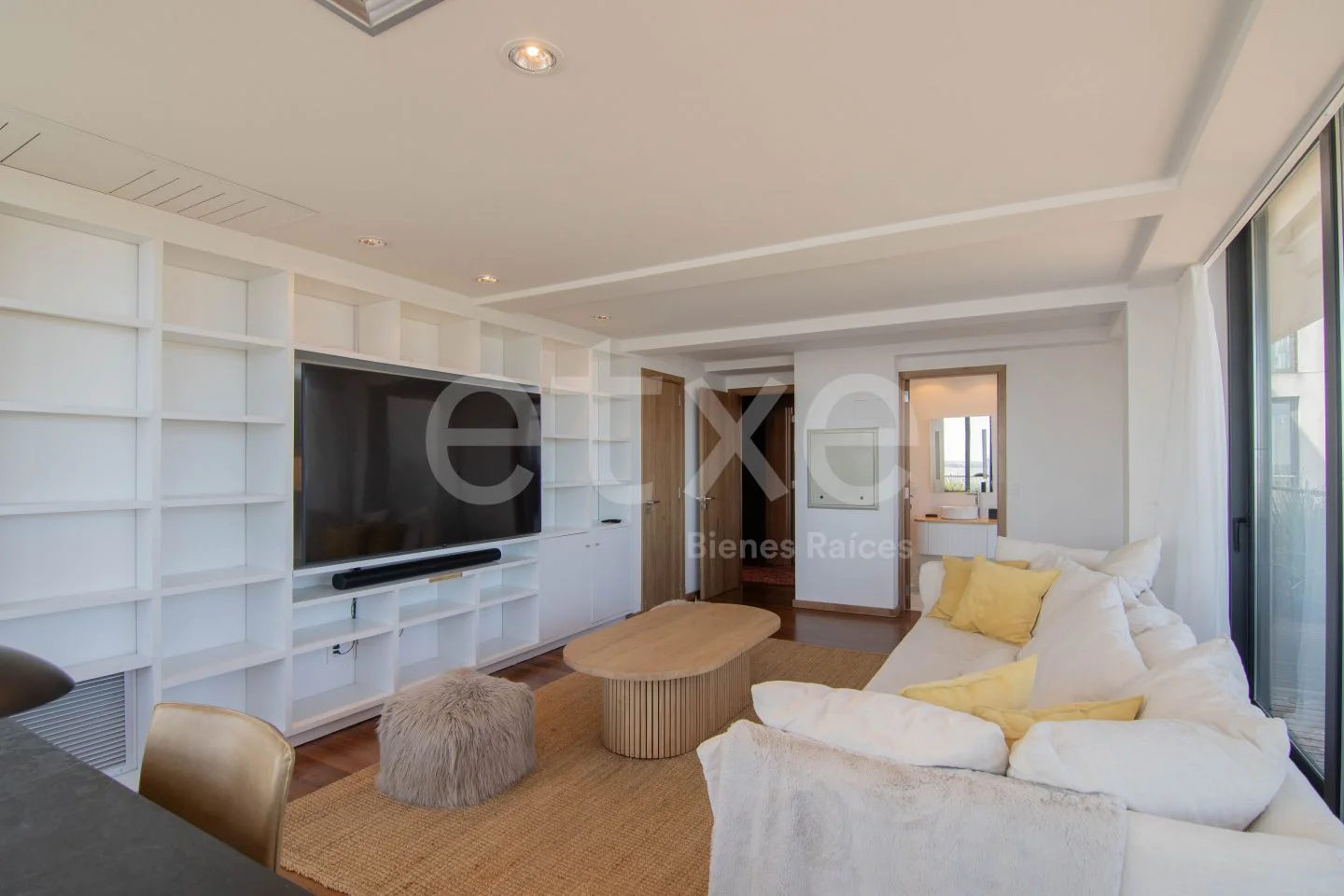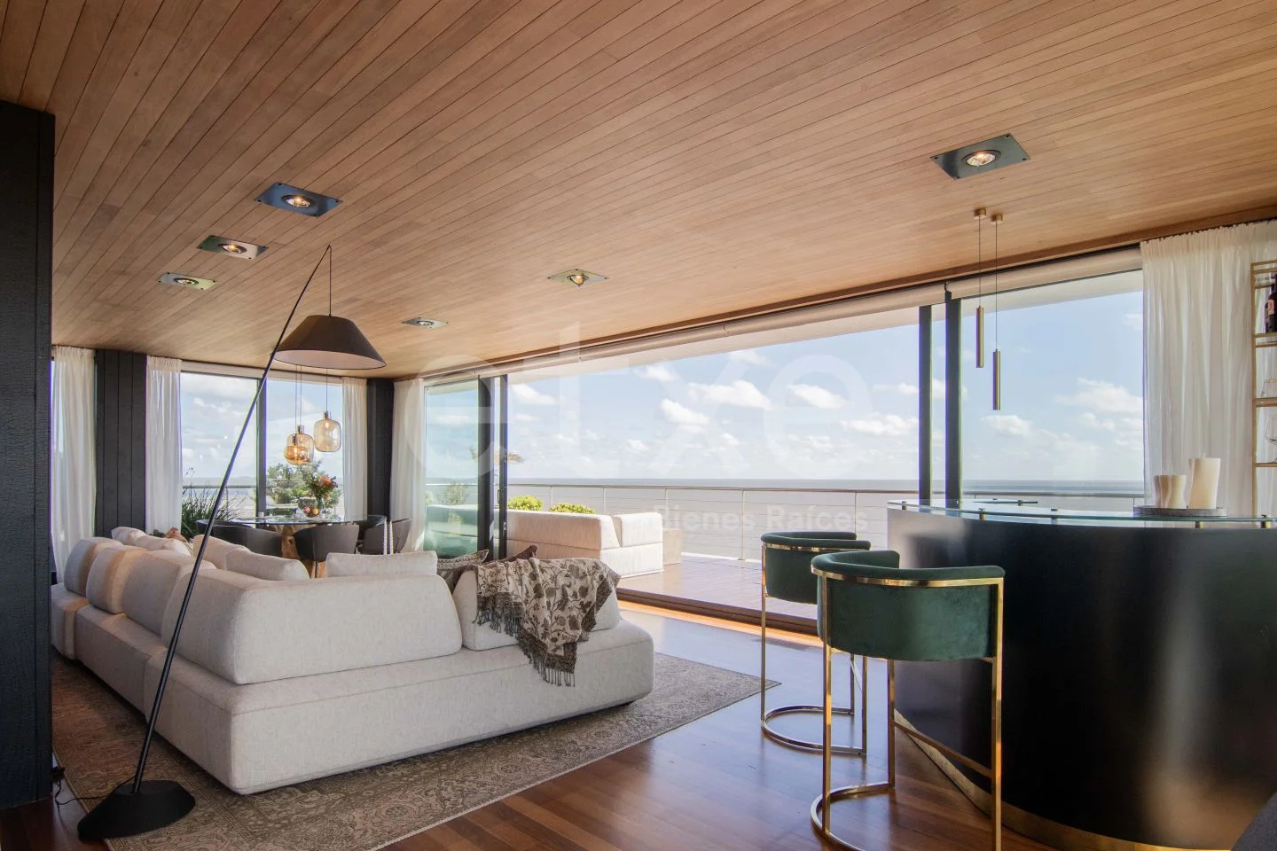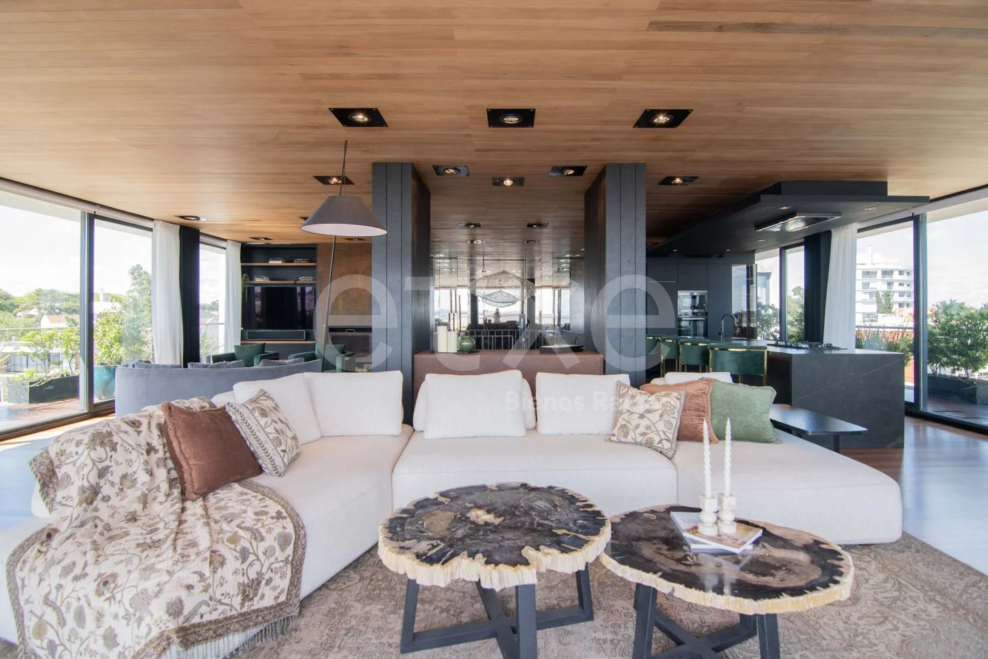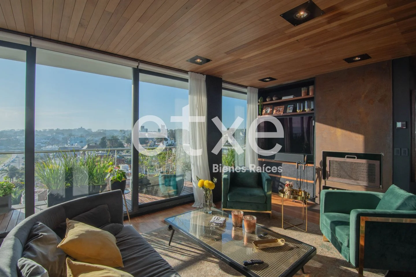 The entrance opens to an open-concept floor with a stunning panoramic view. Large windows flood the space with natural light, creating a bright and inviting atmosphere. The layout includes living room, dining area, bar, lounge, and kitchen-each with direct access to an impressive terrace. The lounge features a wood-burning fireplace with excellent draft, finished in iron. Laundry area and guest bathroom.