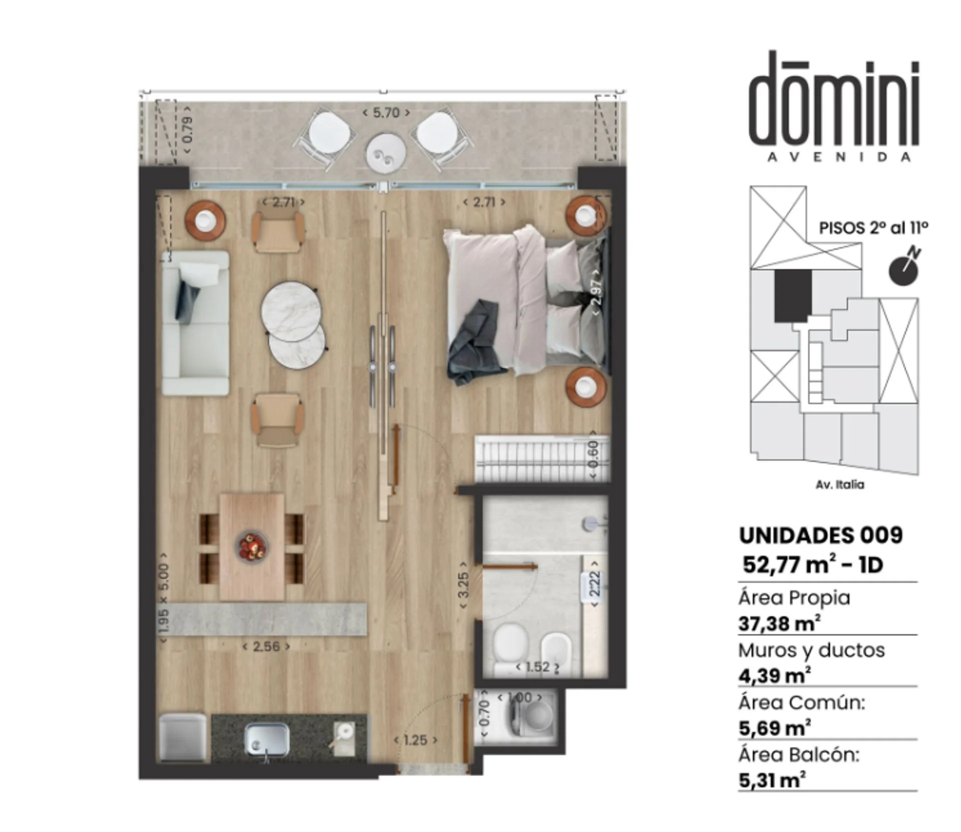 La unidad cuenta con 37,38 m2 edificados y 5,31 m2 de terraza. Al entrar nos encontramos con la cocina, baño y el área para el lavarropas, mas adelante a la derecha se encuentra el living comedor con salida a la terraza y a la derecha se encuentra el dormitorio, también con salida a la terraza.