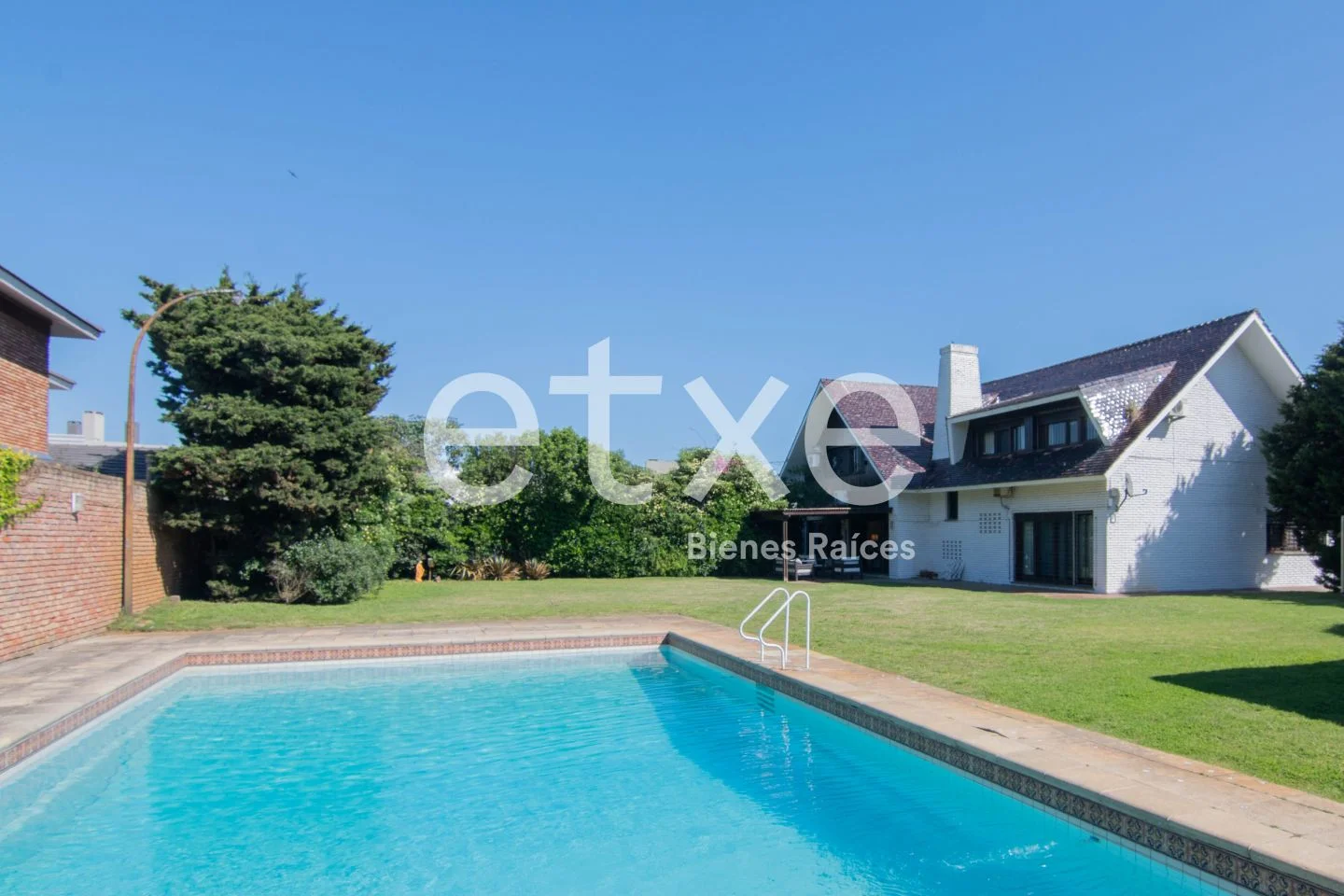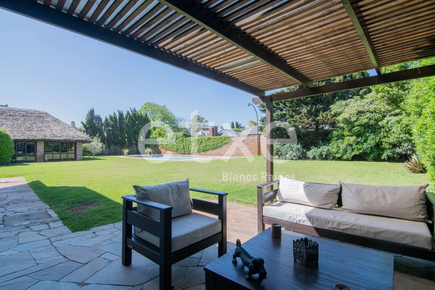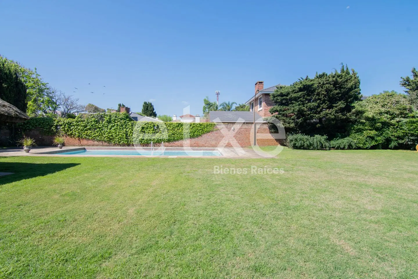 Enorme jardín con piscina y barbacoa. Parrillero con barra de madera y baño.