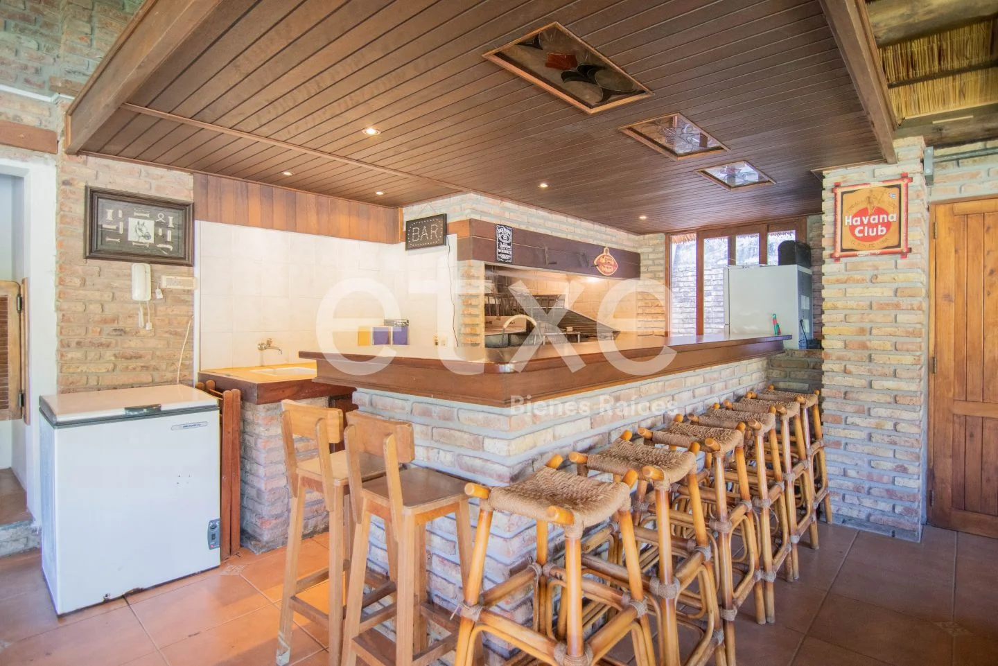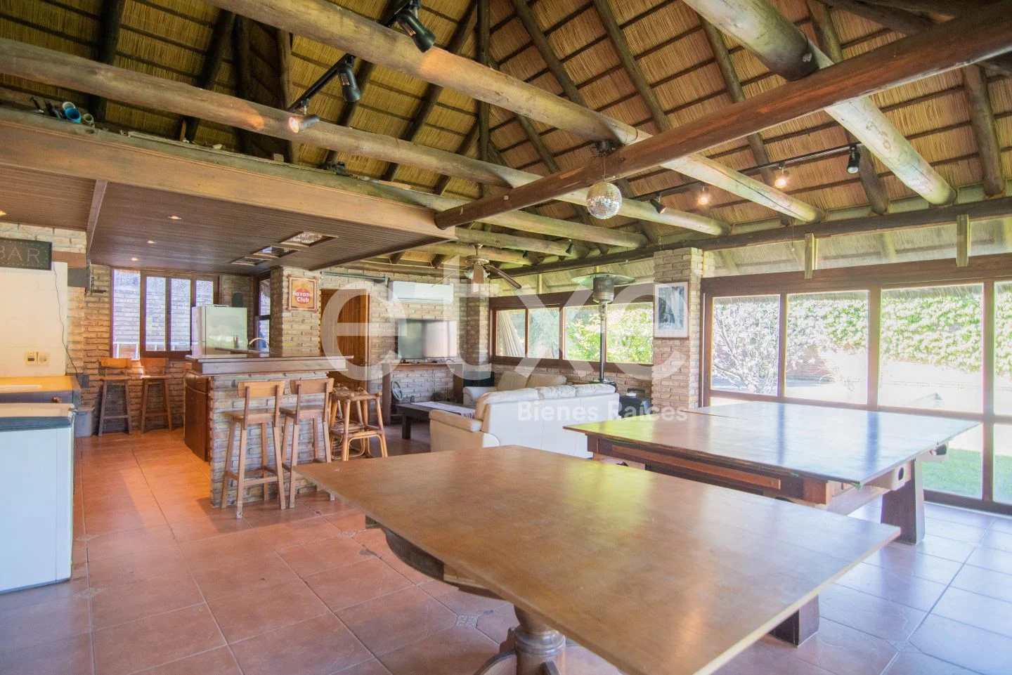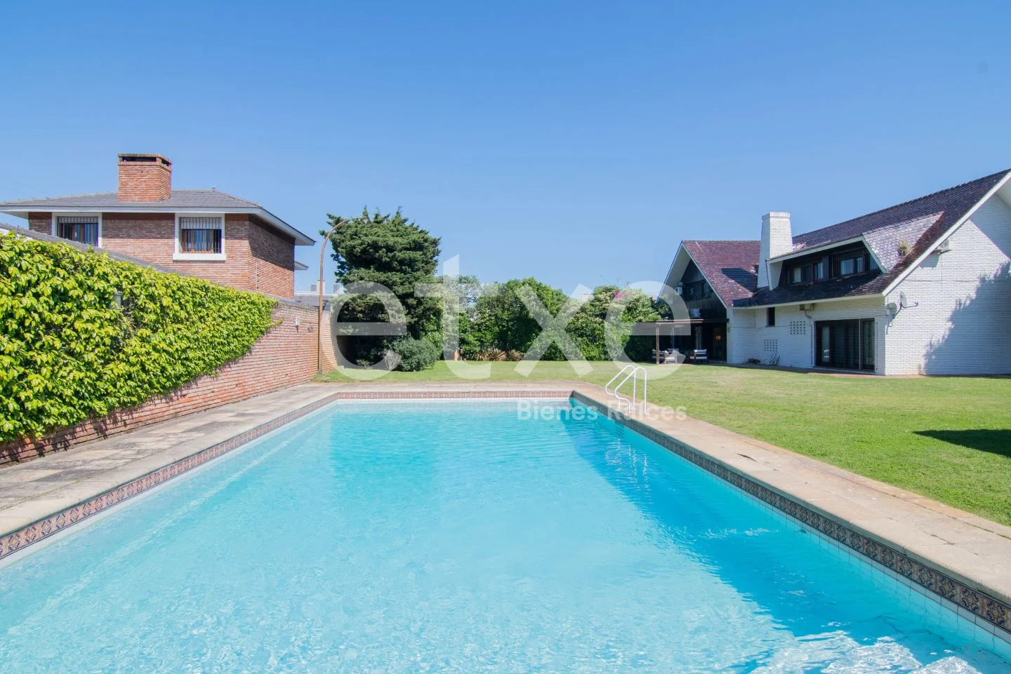 Enorme jardín con piscina y barbacoa. Parrillero con barra de madera y baño.