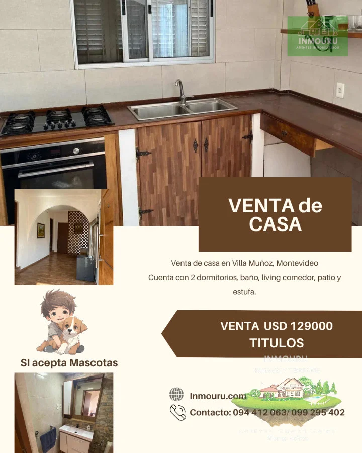 Casa en Villa Muñoz - Montevideo (Gral Pagola esquina Democracia) Excelente oportunidad, padrón único. Casa en esquina, independiente, orientación norte, super soleada. Dos dormitorios, baño, living con estufacalefactor a leña eficiente. Cocina con anafe y horno eléctrico, mesada de madera, conexión para lavarropas y secarropas. Excelente presión de agua. Patio con parrillero, todo cerrado. Cerca eléctrica con alarma y WIFI. Circuito de cámaras de seguridad (CCTV) NO ACEPTA BANCO (Tiene deuda que se salda al momento de la venta) VENTA: 129000 Consulte con nuestros asesores. Referencia Interna : Tera-2013