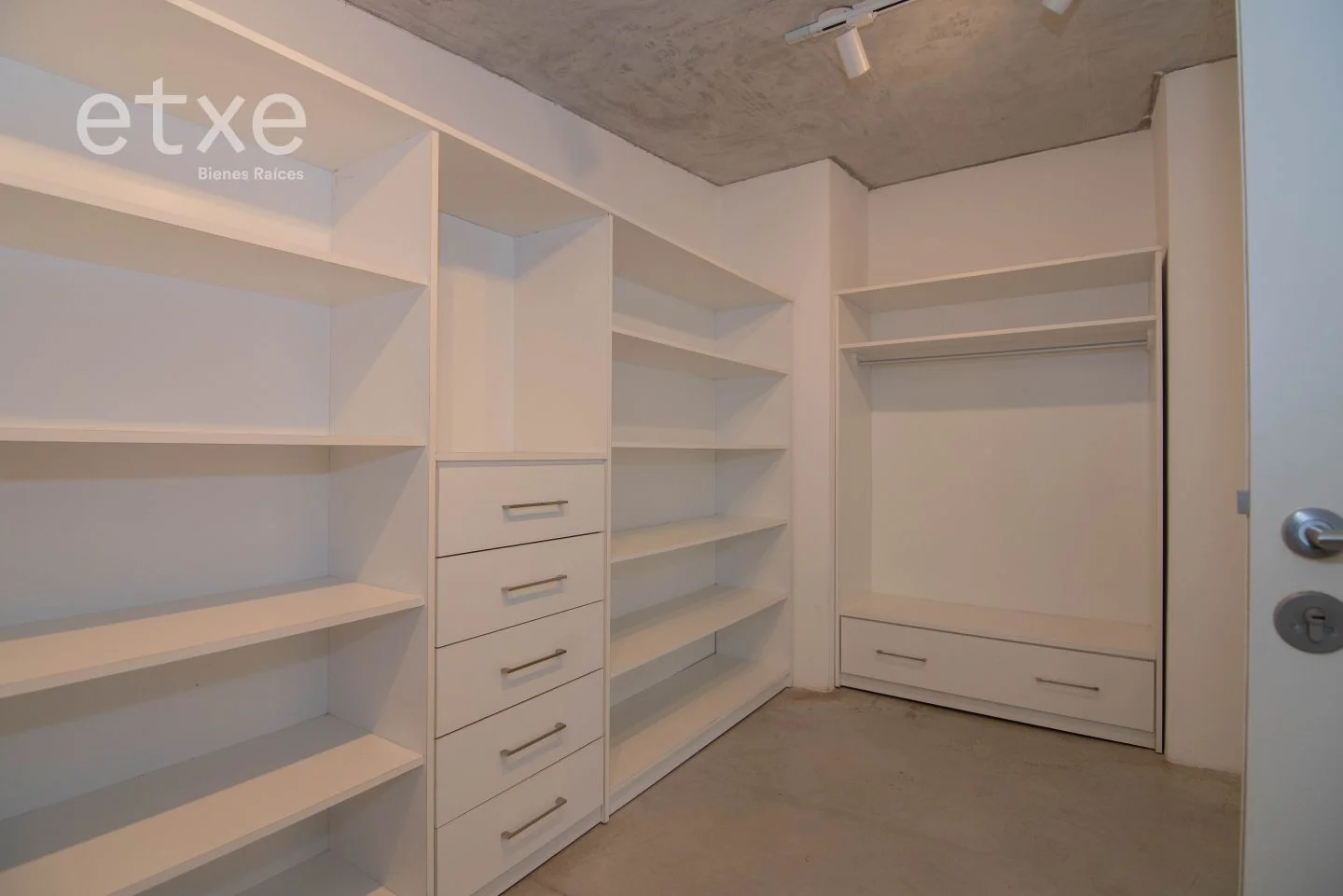 El apartamento cuenta con baño social, lavadero y espacio para heladera cubierto por puertas de madera que hace parecer que no hay nada detrás. A su vez cuenta con un enorme vestidor y baño completo.