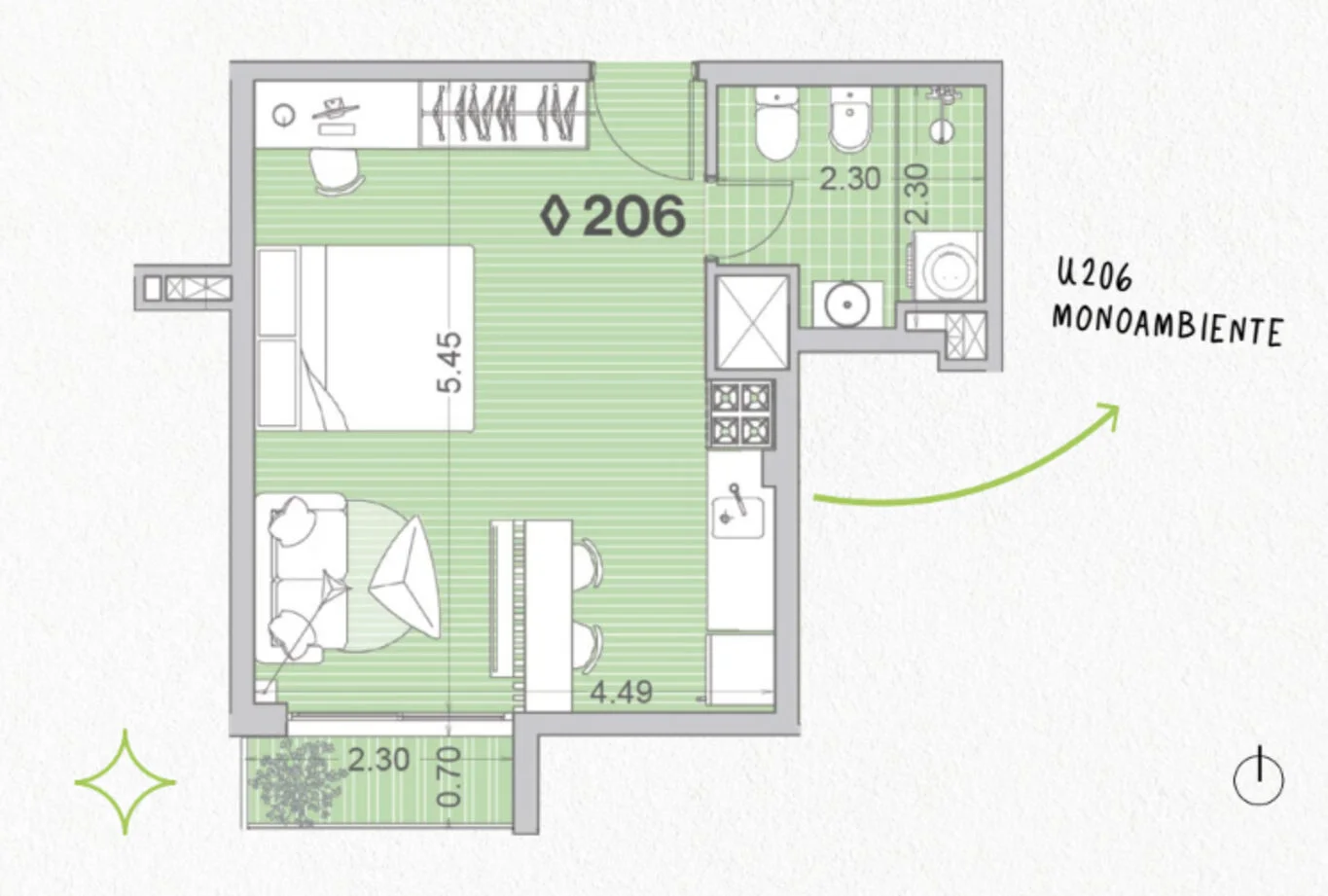 - Amplio ambiente principal con excelente iluminación, cocina integrada y baño completo.