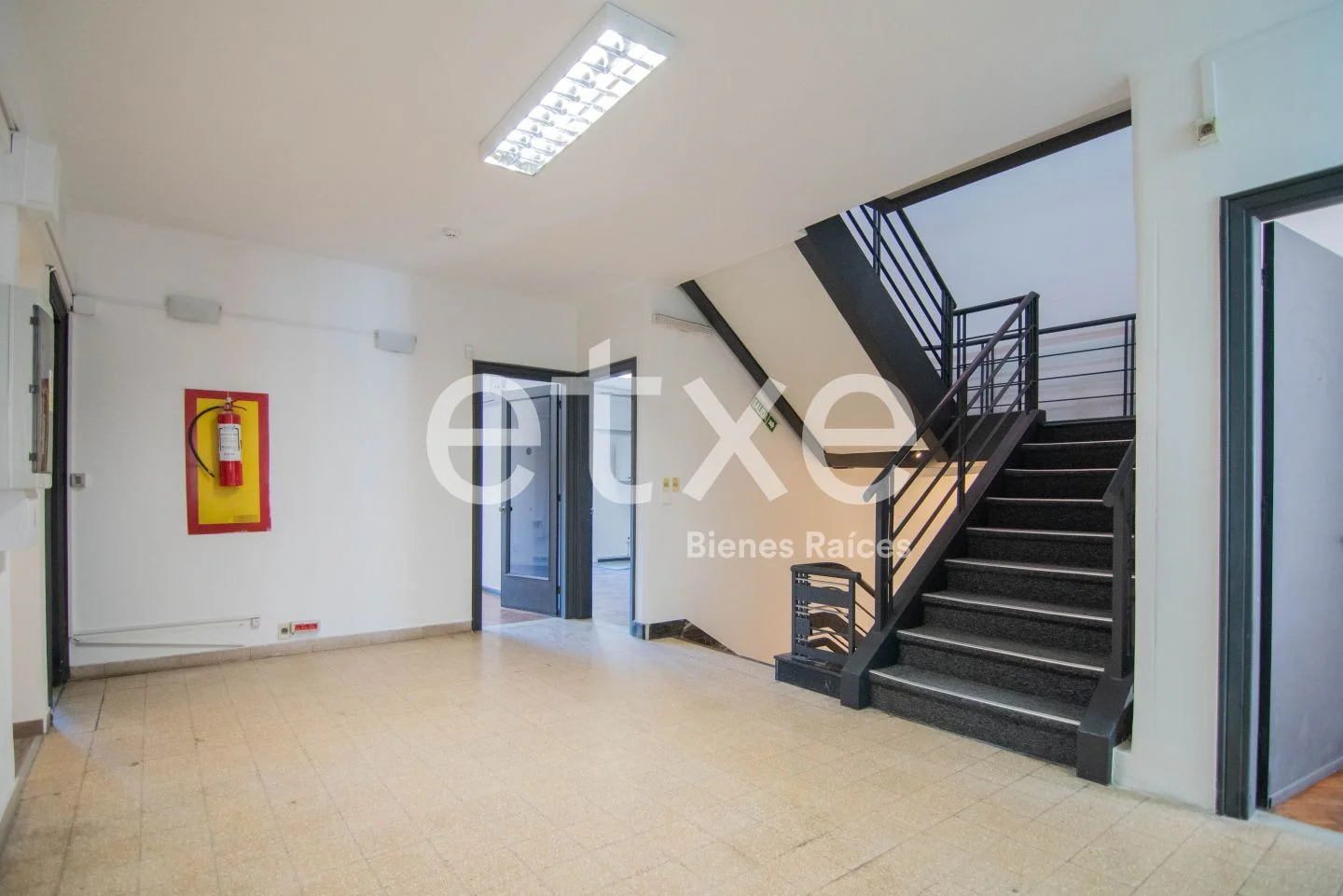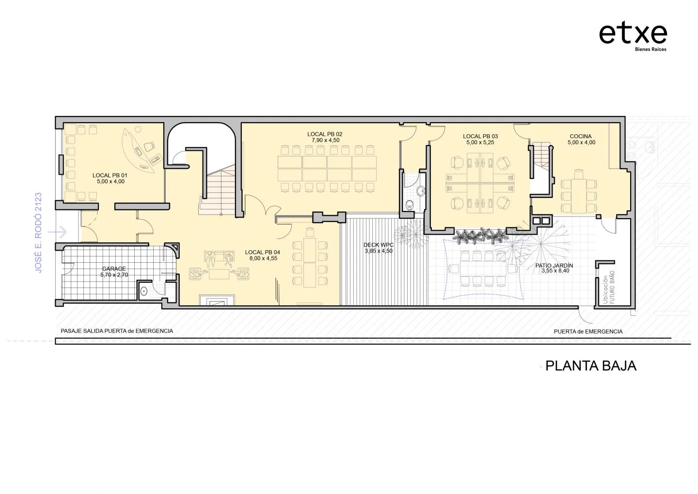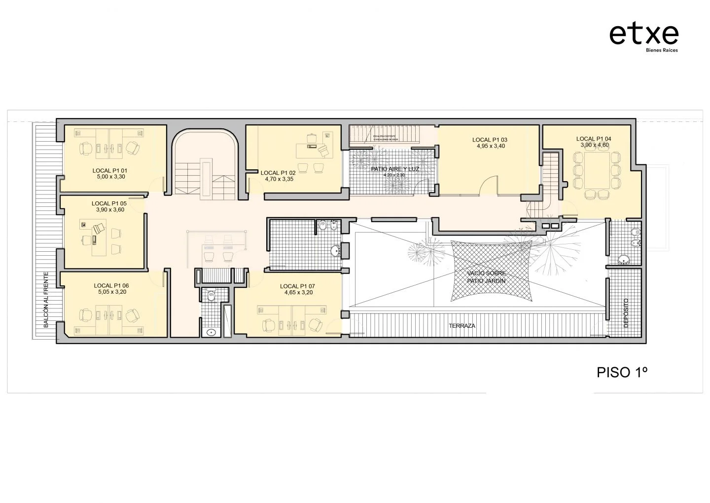 En la planta baja, cuenta con recepción, hall de distribución, dos salas de reuniones, depósito y baño. Además, tiene conexión al comedor y la cocina con salida al patio.