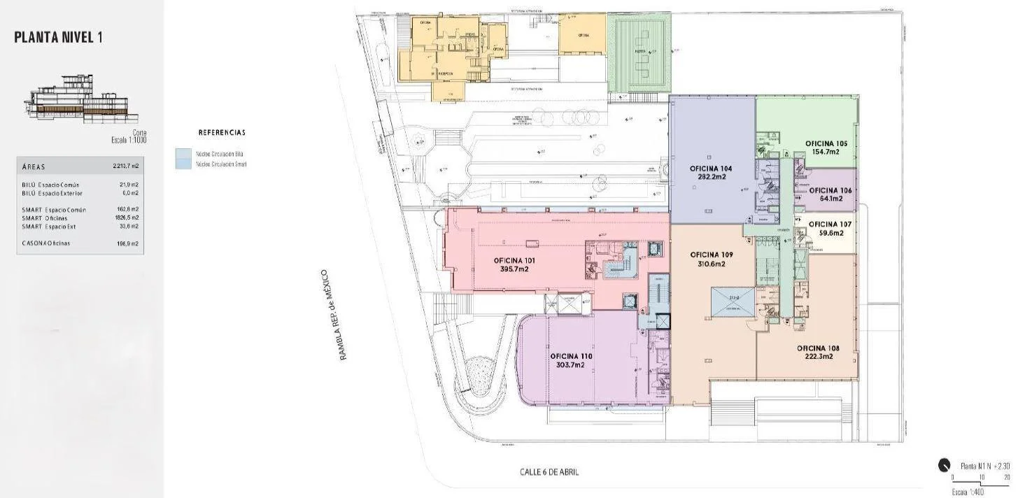 El complejo cuenta con la torre de oficinas, la casona, y un jardín patrimonial de uso común. Así también un rooftop de usos múltiples que puede utilizarse con previa reserva.