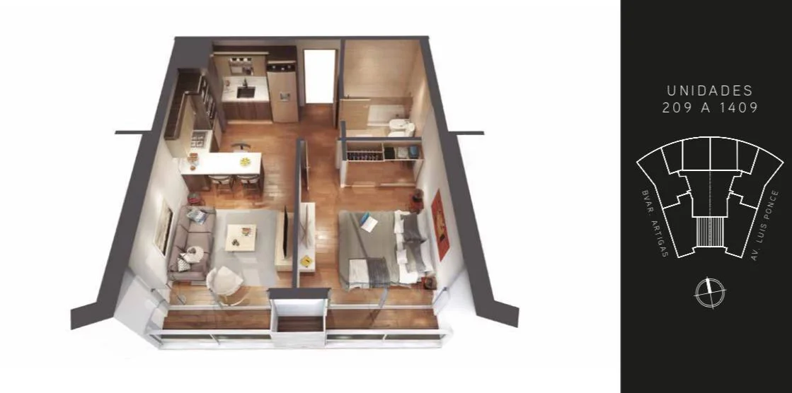 Apartamento premium de 1 Dormitorios en el piso 17, equipado con horno, anafe y campana de extracción, muebles bajo y sobre mesada. Pisos de porcelanato simil madera. Losa radiante por caldereta a gas sectorizada individual.
