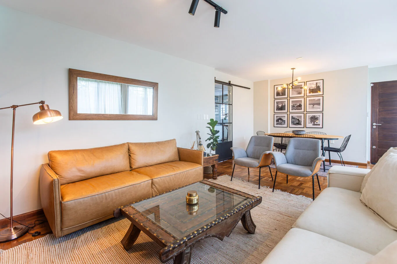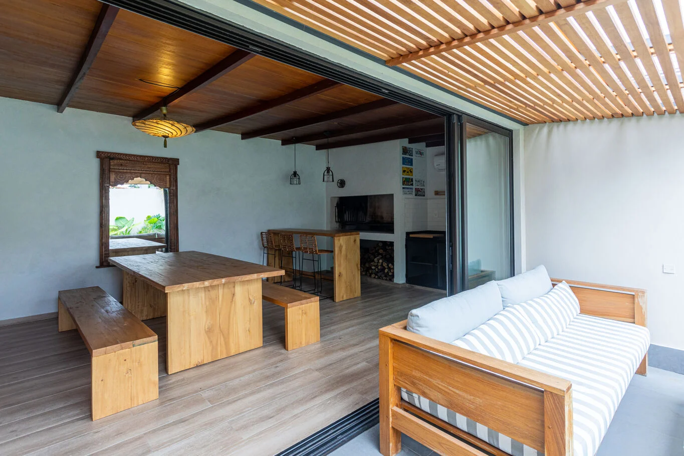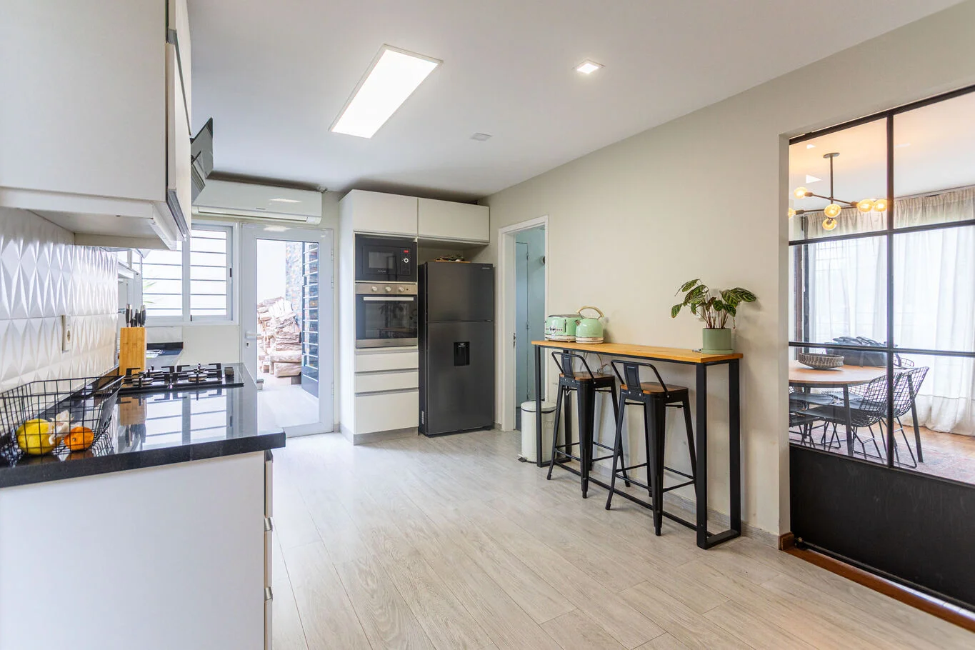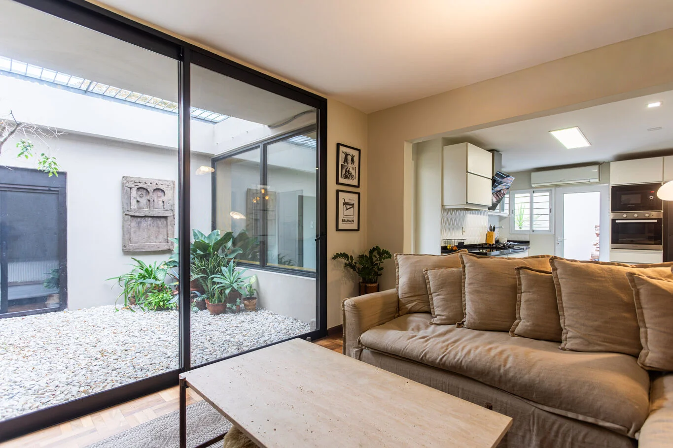 Una puerta de hierro y vidrio, cuidadosamente elegida, conecta este espacio con la cocina, generando una transición armónica entre lo social y lo cotidiano.