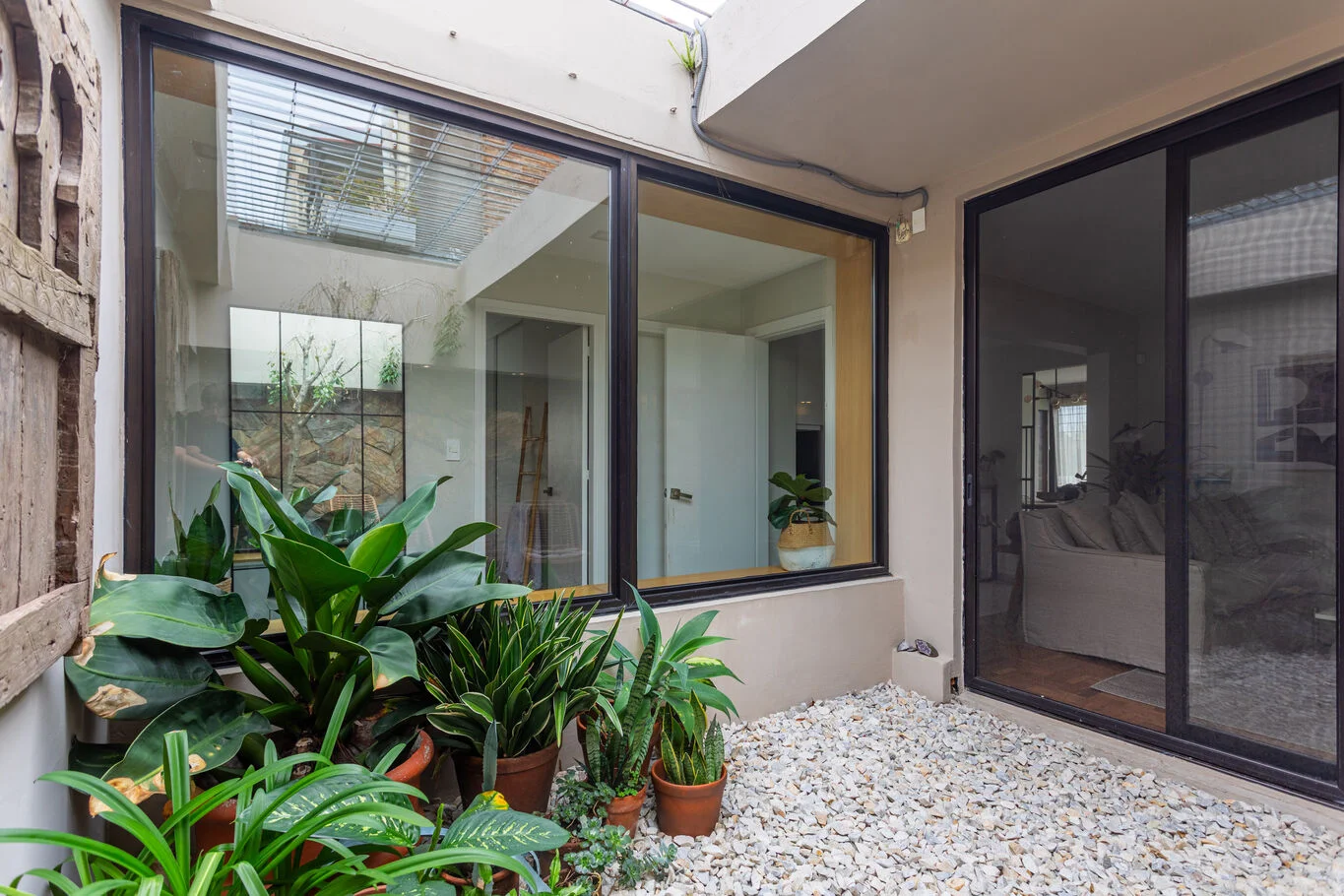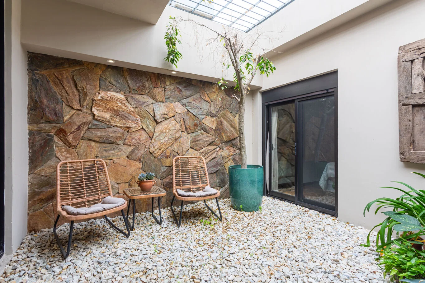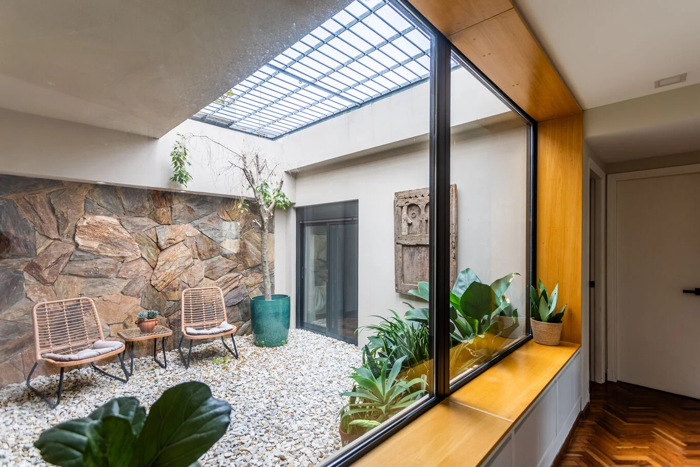 La cocina, con estar diario y estufa a leña de alto rendimiento, se convierte en uno de los espacios protagonistas de la casa. Su vínculo directo con un jardín interior aporta luz natural constante y una sensación de calma que atraviesa todo el ambiente.