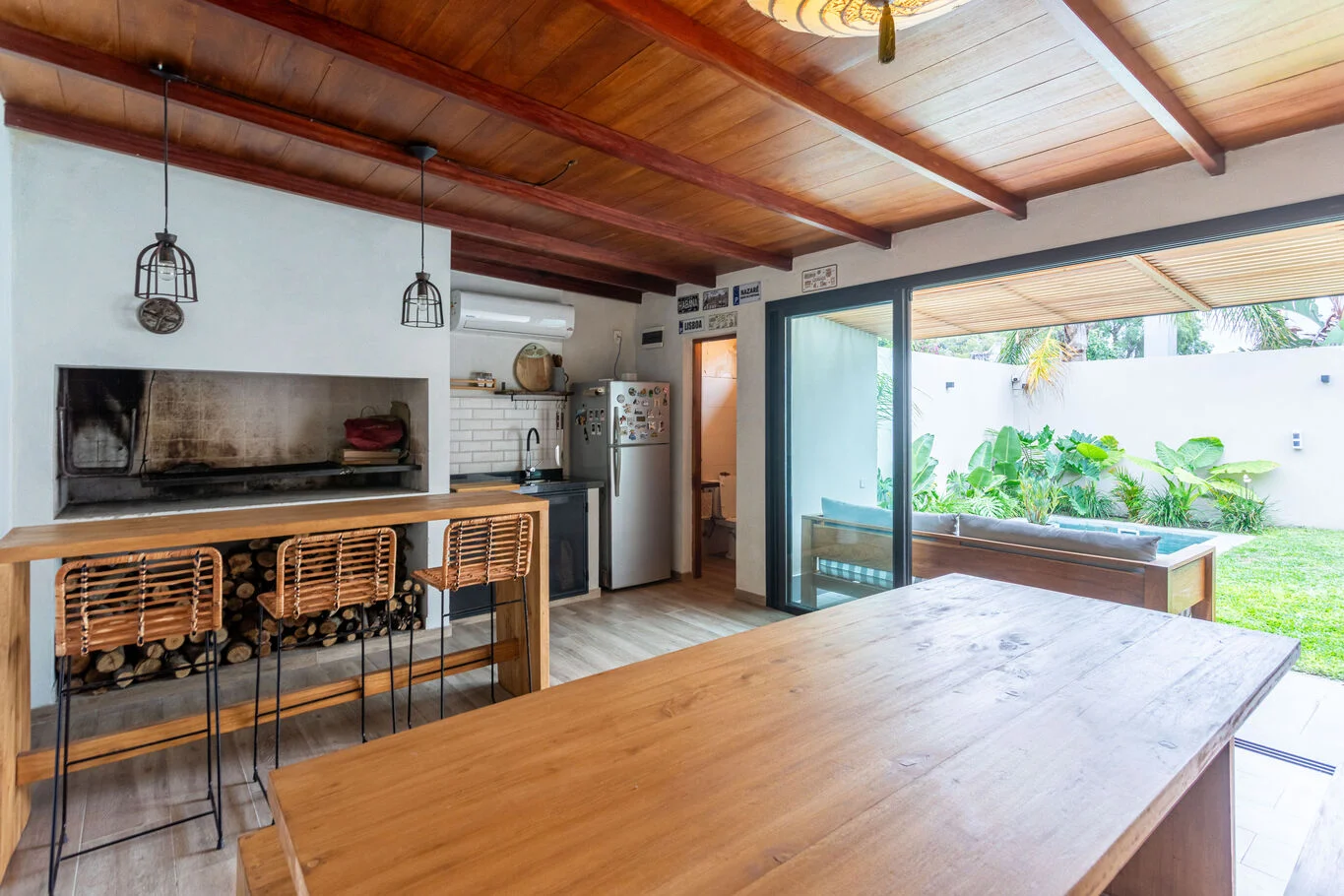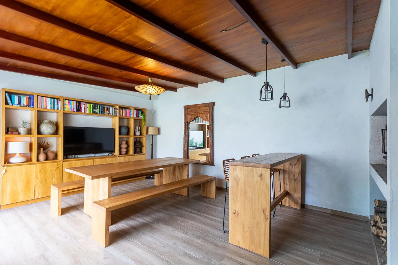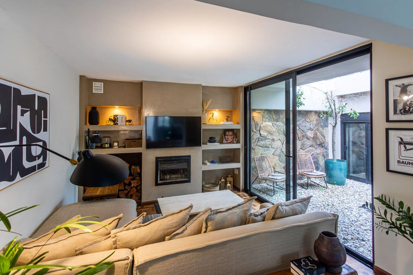 La cocina, con estar diario y estufa a leña de alto rendimiento, se convierte en uno de los espacios protagonistas de la casa. Su vínculo directo con un jardín interior aporta luz natural constante y una sensación de calma que atraviesa todo el ambiente.