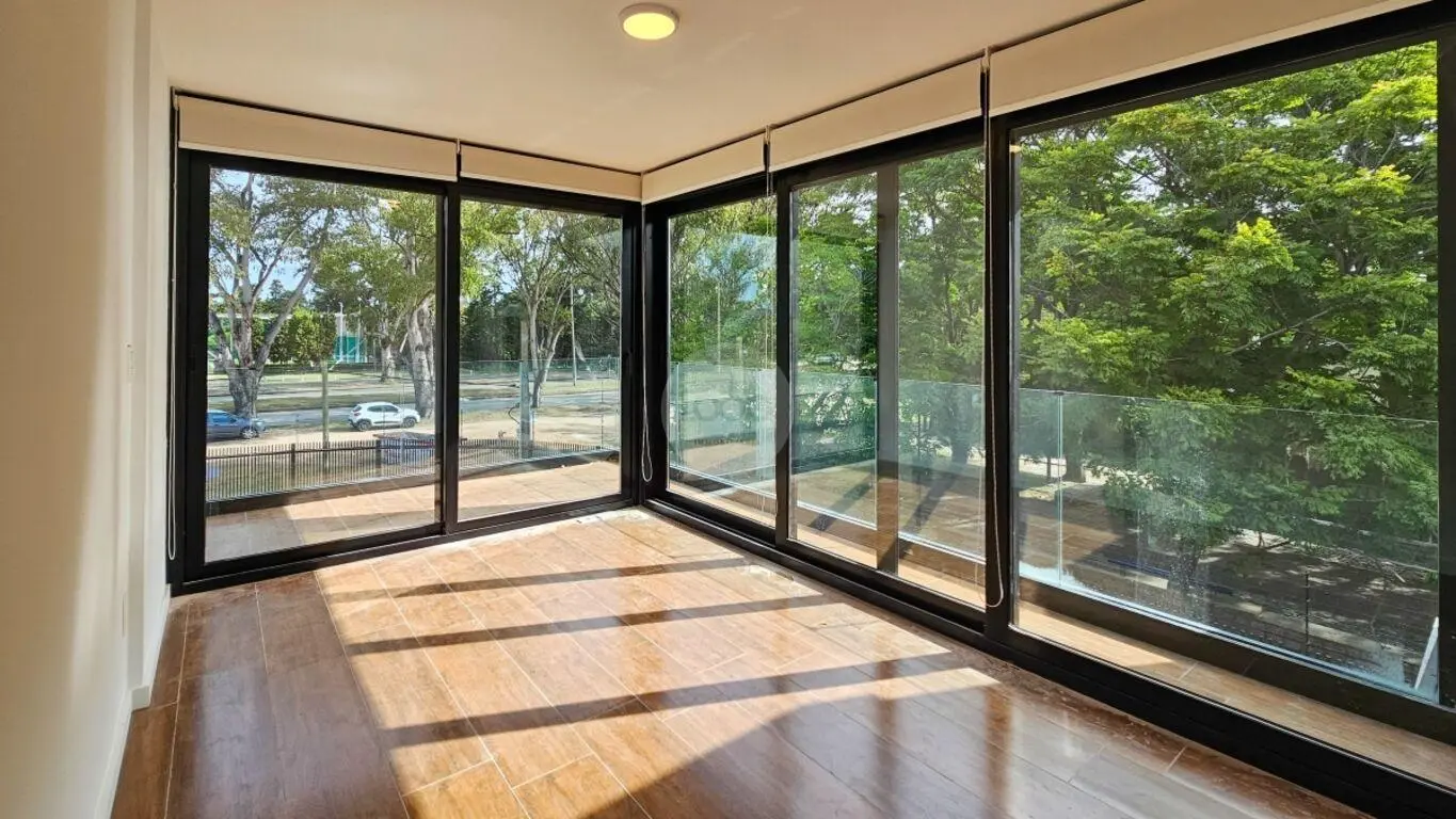 - Ventanales DVH de piso a techo con persianas eléctricas