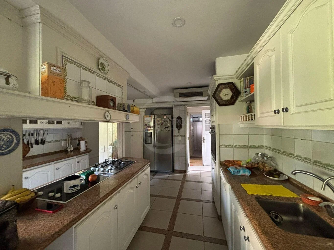 At the front, an automatic gate with a protective fence provides enhanced security and convenient access. On the ground floor, the home features a generous living room with a wood-burning stove, alongside a modern area with direct access to the patio, creating integrated and bright living spaces. There is also a cozy dining and family room, as well as a large defined kitchen with access to the patio. This level includes three bedrooms with built-in closets, two full bathrooms, and a service bedroom with its own bathroom.
