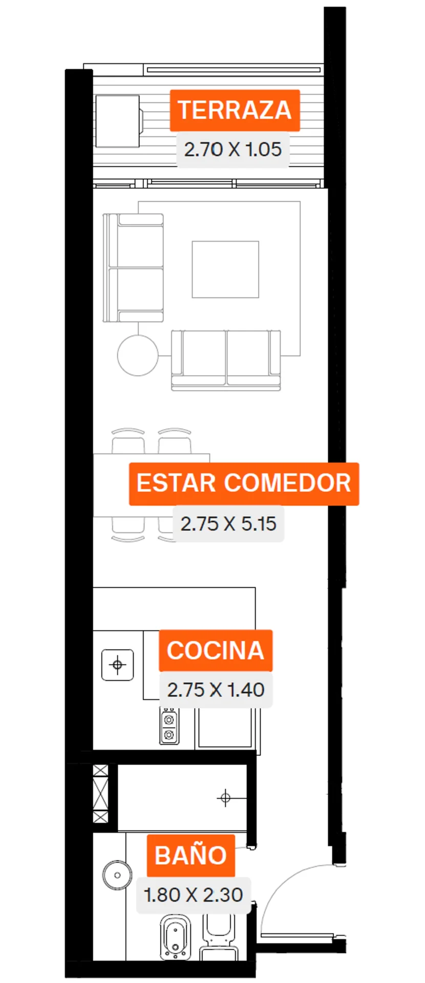 Se trata de la unidad 305 al frente con 28m2 internos y 3m2 de terraza.