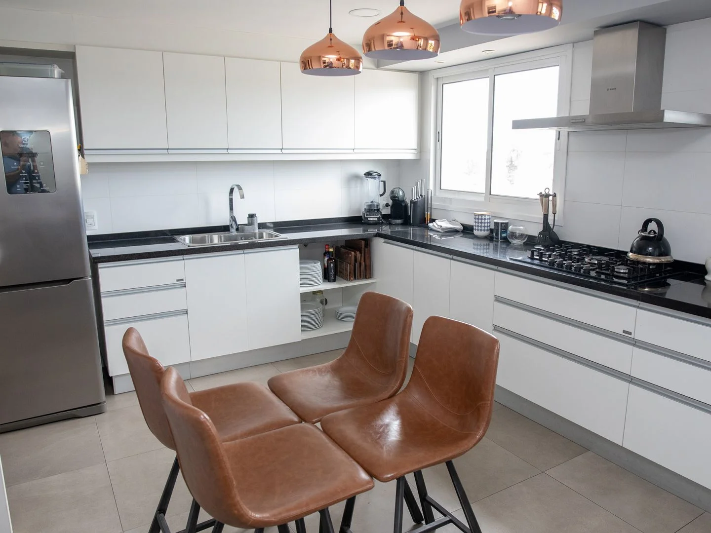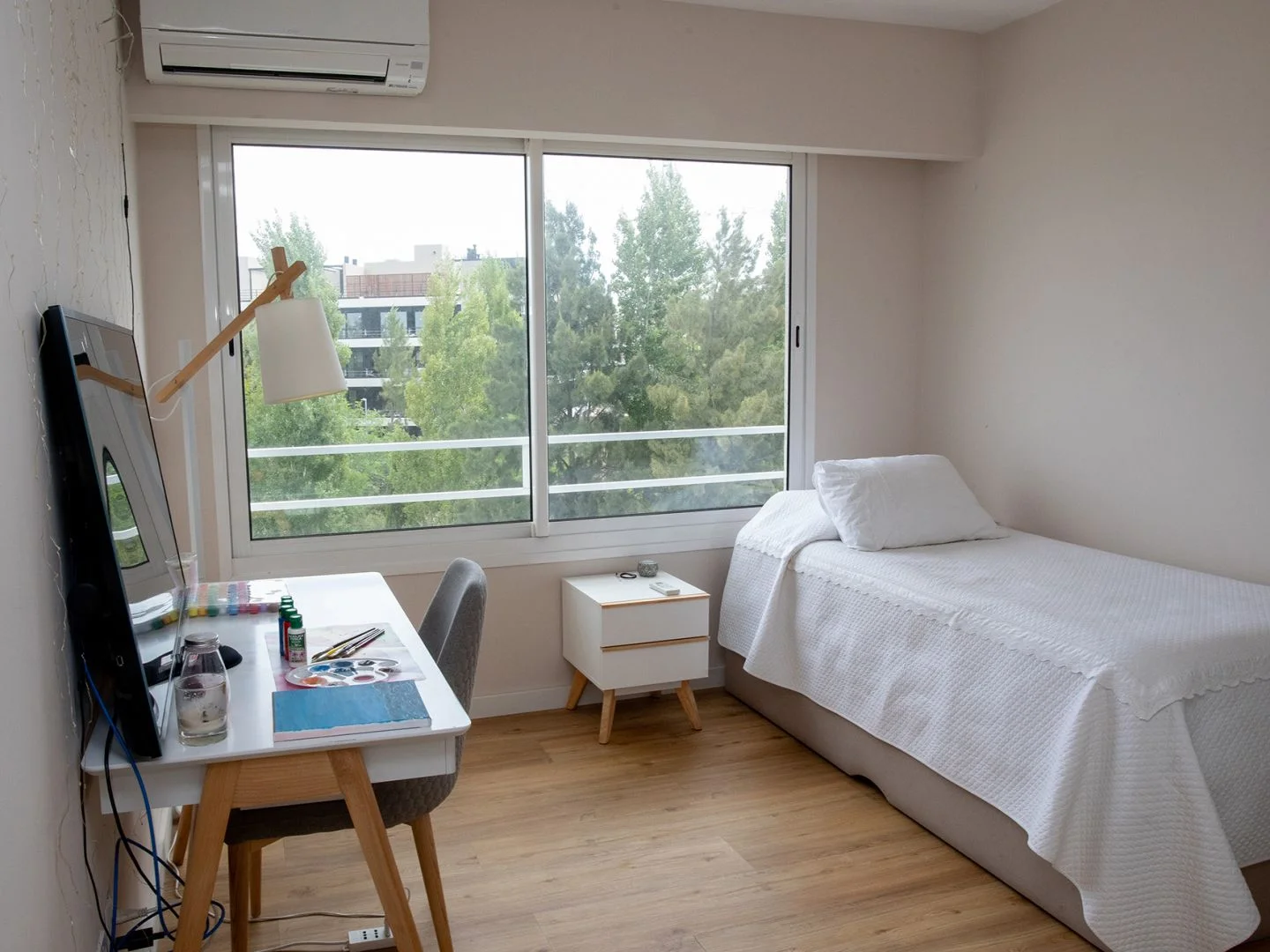 Calefacción por losa radiante a gas y aire acondicionado con termostato por ambiente. Agua caliente por caldereta a gas.